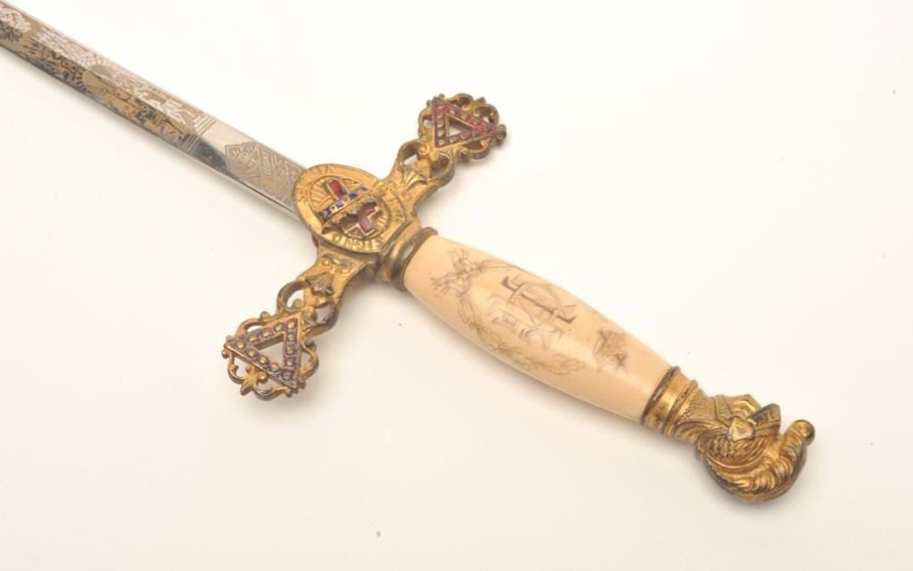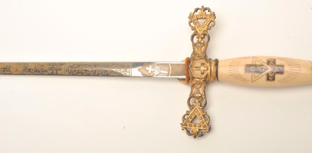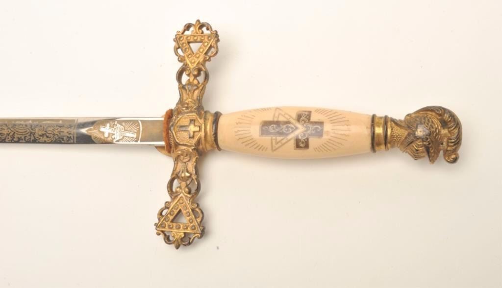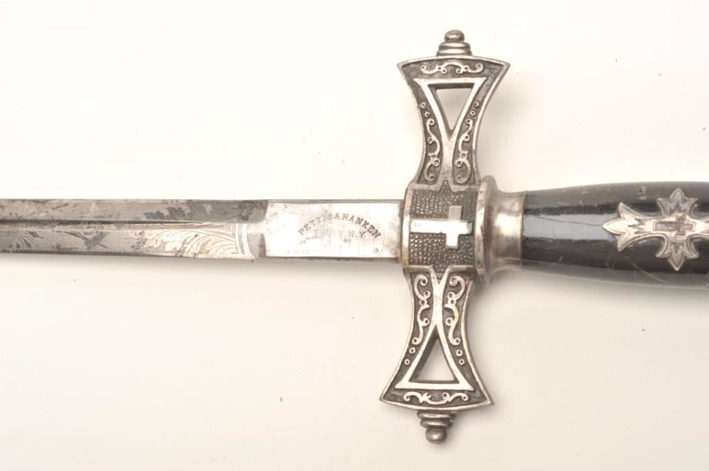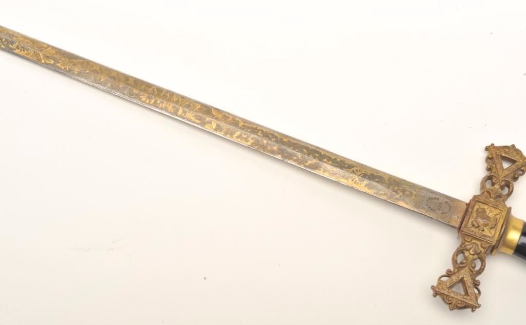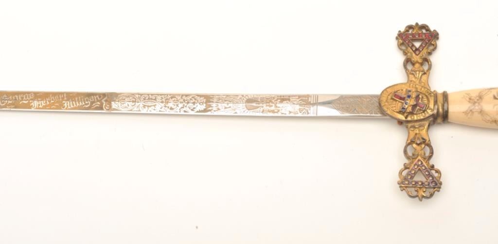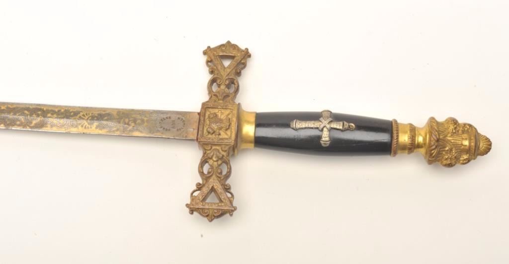 Lot of 3 Knights of Columbus/Lodge swords (no scabbards), including one by Schnitzler, Solingen with etched and inscribed blade “M. V. Biscailuz”, also agent marked “A. J. Plate & Co., San Francisco, Cal.; one by thePettibone Bros. & Co. with etched and inscribed blade “George Herbert Milligan” and displaying a bone etched grip with fancy cross guard; also a Pettis & Ranken, Troy, N.Y.-made sword with etched blade andinscribed “J. D. Watkin”. Names may be researchable. Est.: $200-$400.