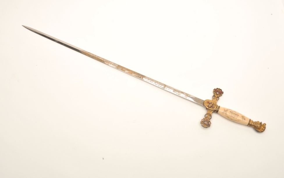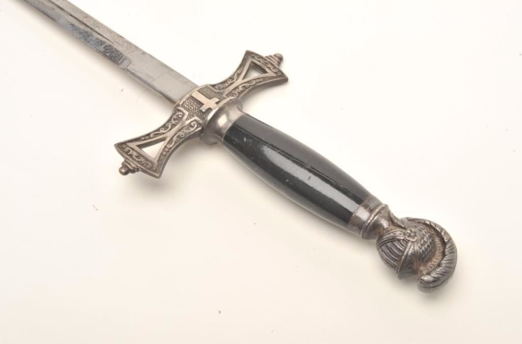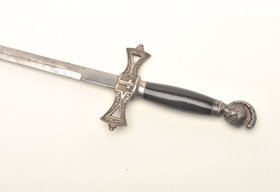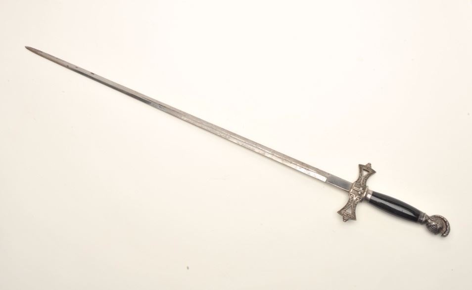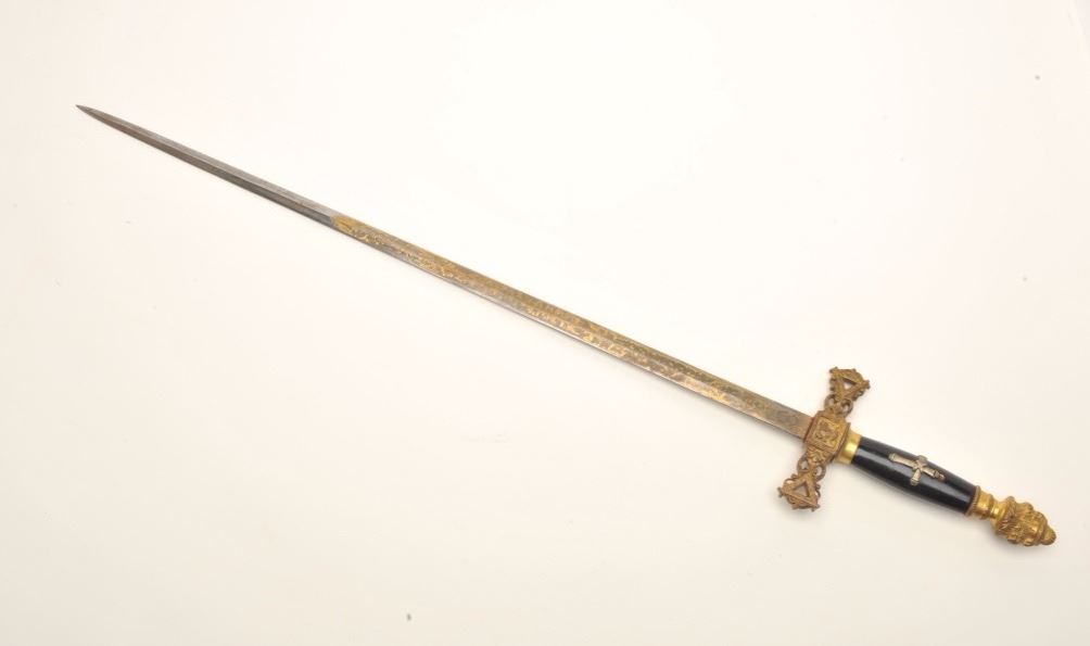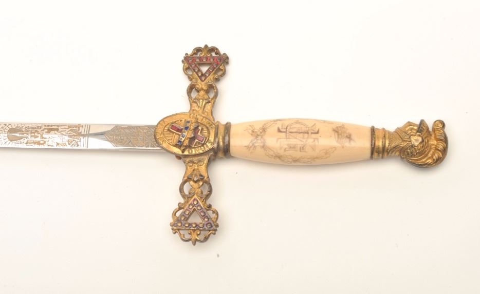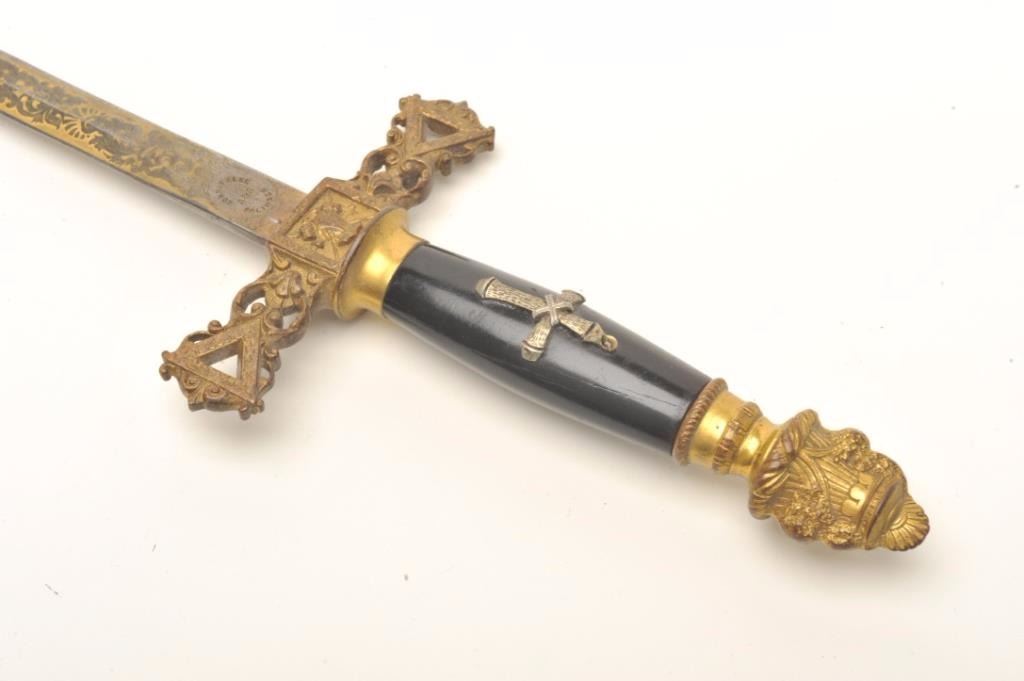 Lot of 3 Knights of Columbus/Lodge swords (no scabbards), including one by Schnitzler, Solingen with etched and inscribed blade “M. V. Biscailuz”, also agent marked “A. J. Plate & Co., San Francisco, Cal.; one by thePettibone Bros. & Co. with etched and inscribed blade “George Herbert Milligan” and displaying a bone etched grip with fancy cross guard; also a Pettis & Ranken, Troy, N.Y.-made sword with etched blade andinscribed “J. D. Watkin”. Names may be researchable. Est.: $200-$400.