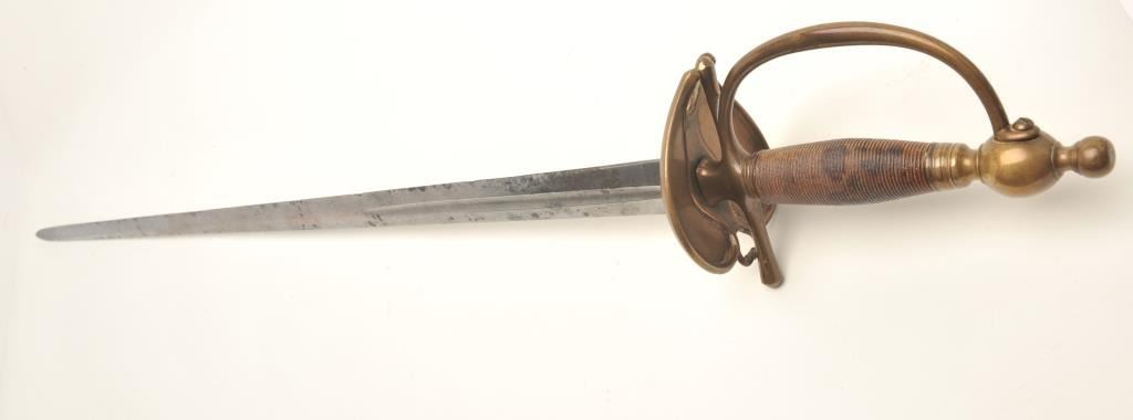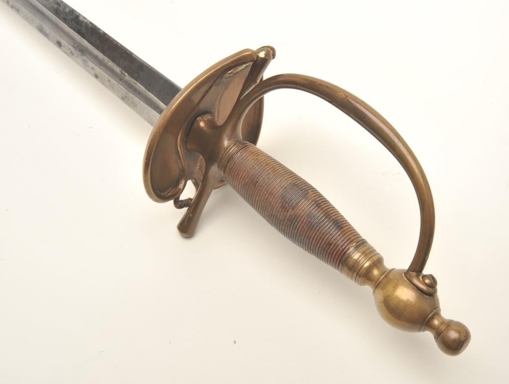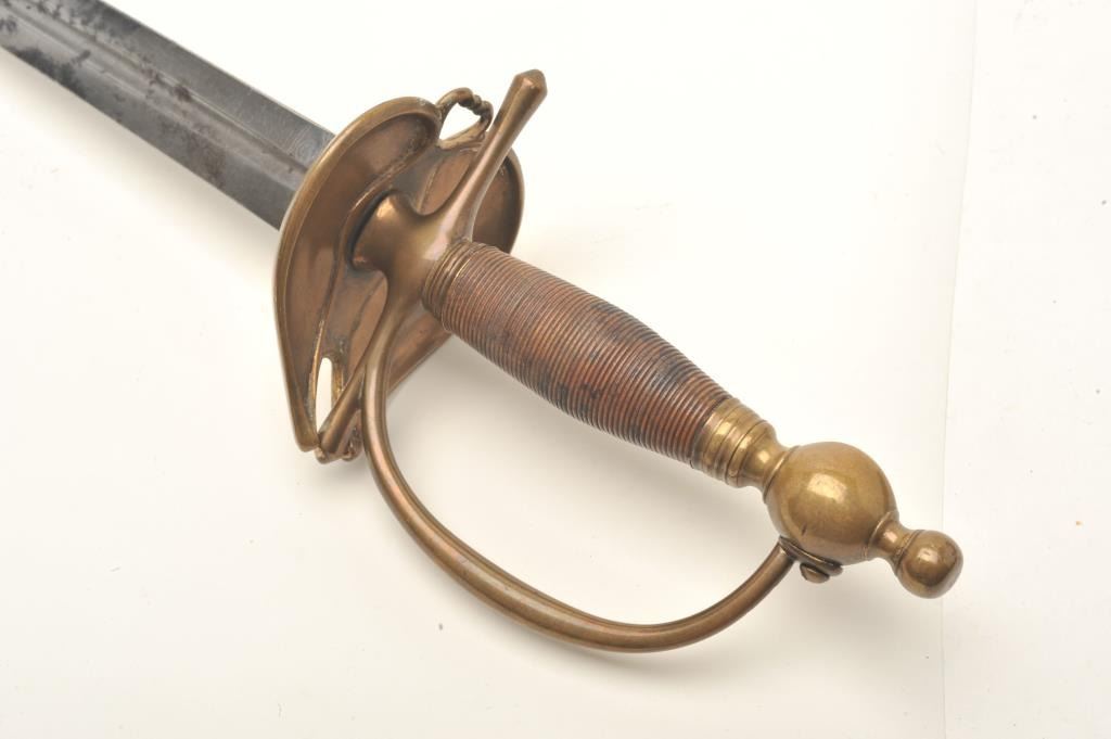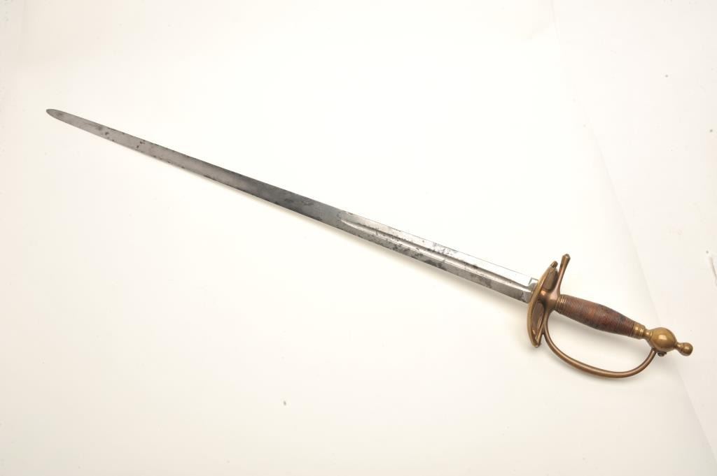 Infantry sword with brass mountings (no scabbard), approximately 40” overall with a 33” etched blade showing some scattered areas of erosion and pitting; taffy colored patina to brass. Est.: $175-$350.