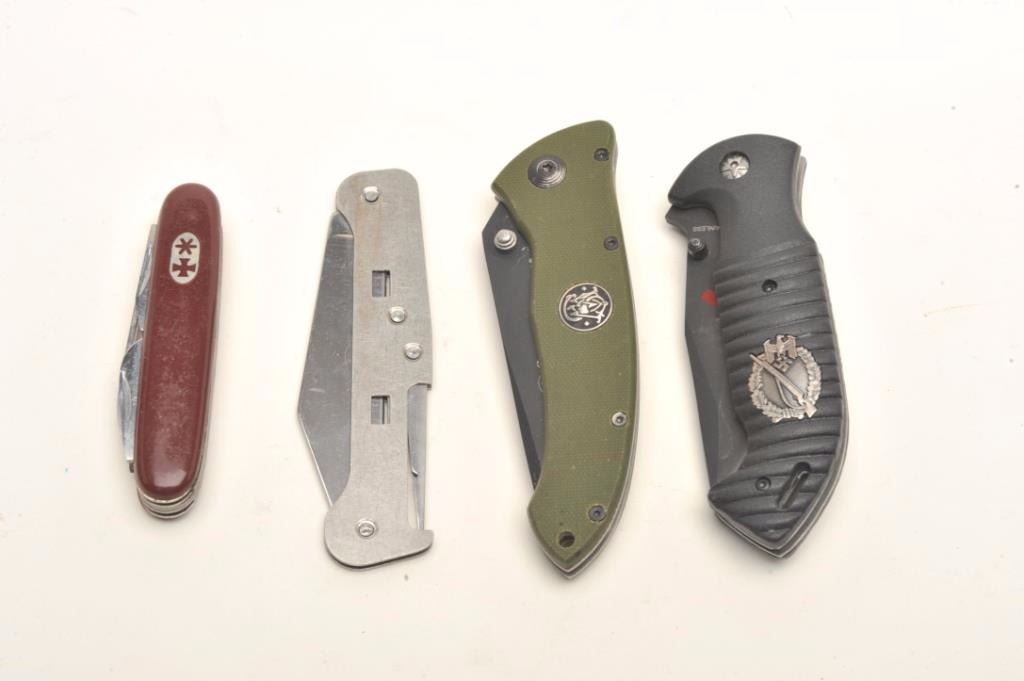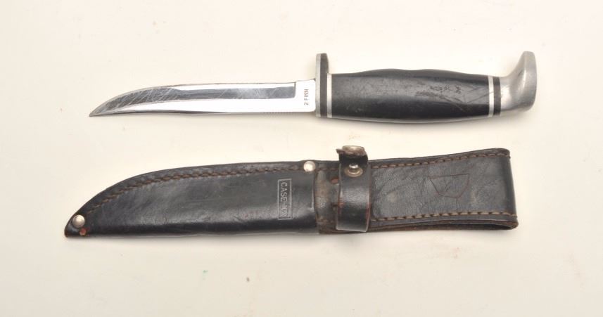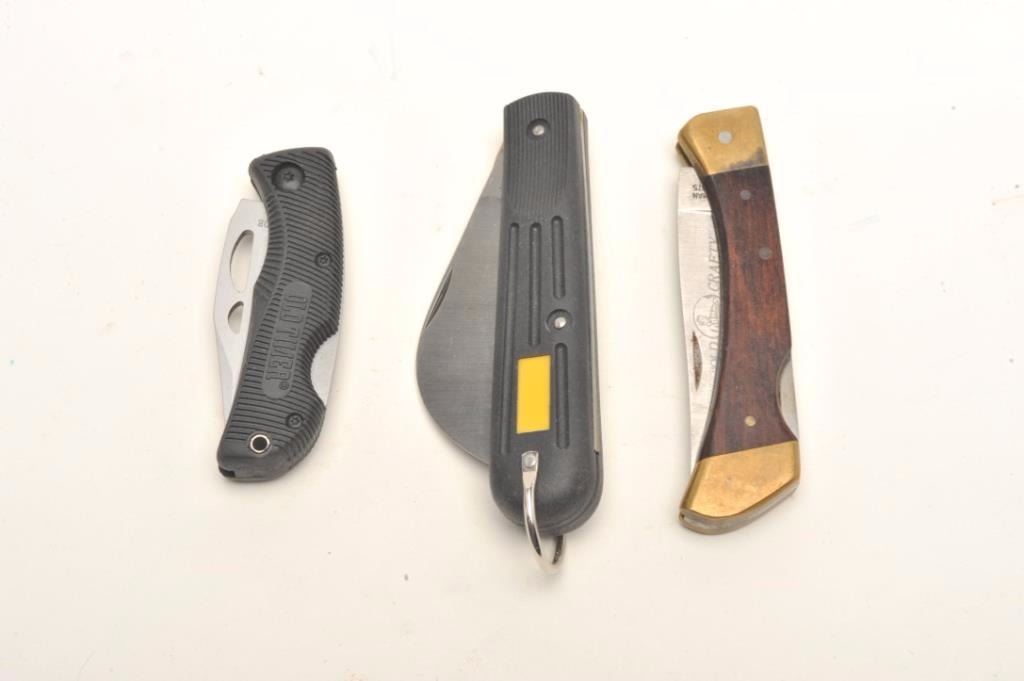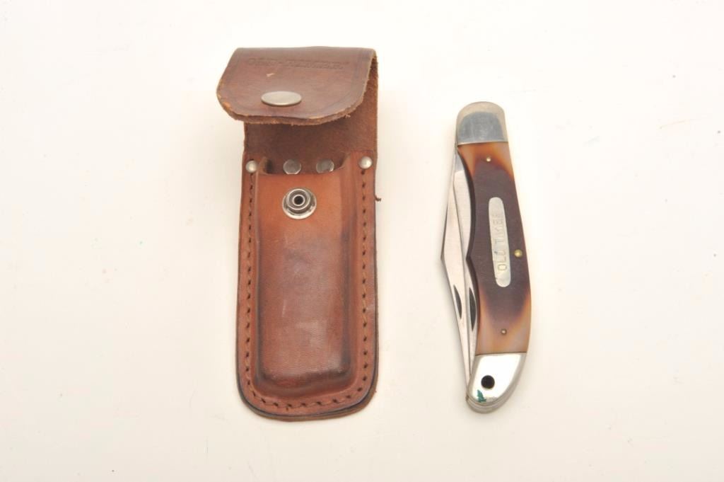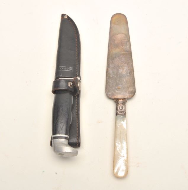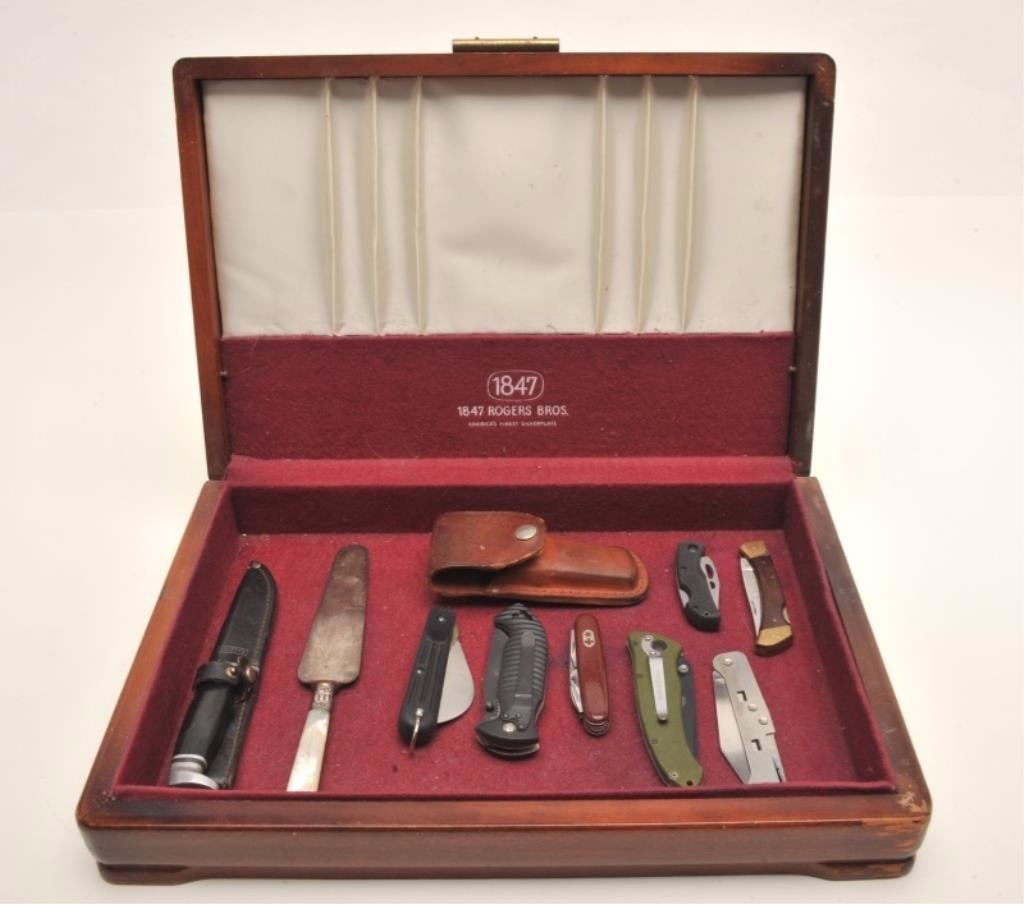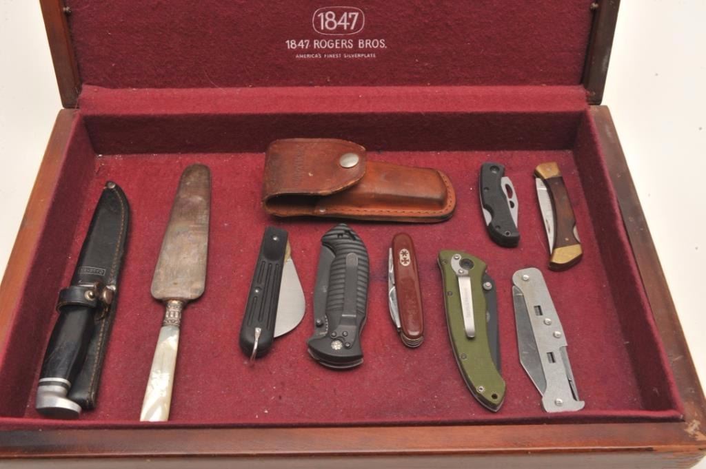 Lot of 9 misc. pocket and belt knives and a small serving piece; knives include an Old Timer folder with leather sheath, a Smith & Wesson Extreme Ops folder, a Case XX belt knife with sheath, an Imperial folder, etc.;all contained in an old Rogers Bros. wood silverware case. Est.: $75-$150.