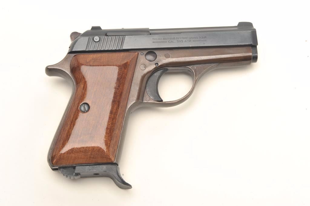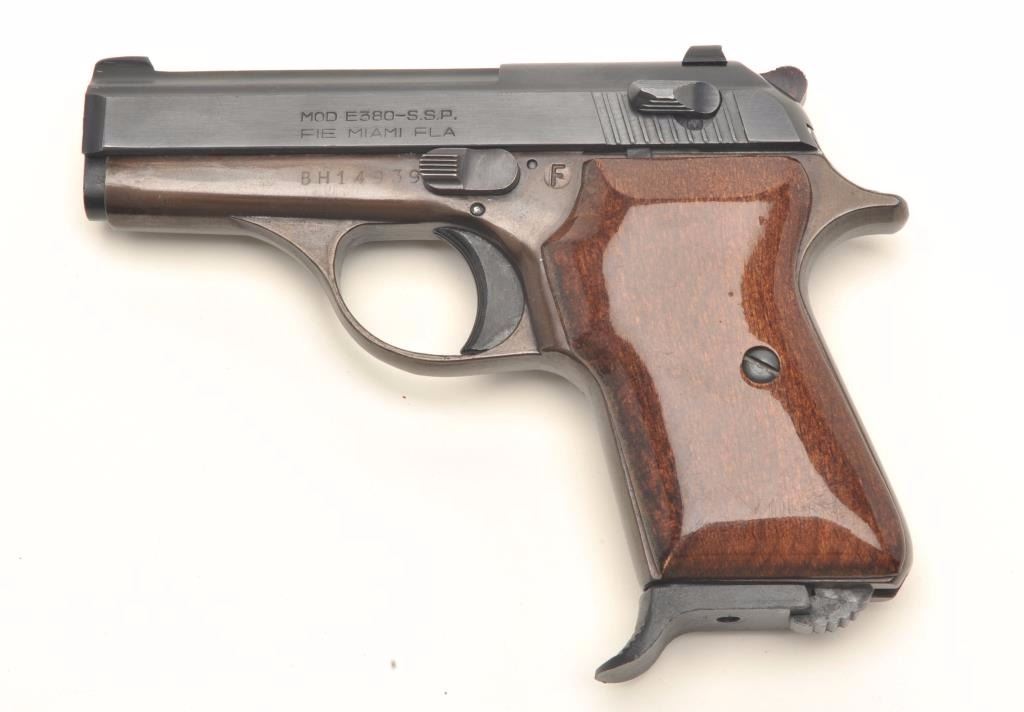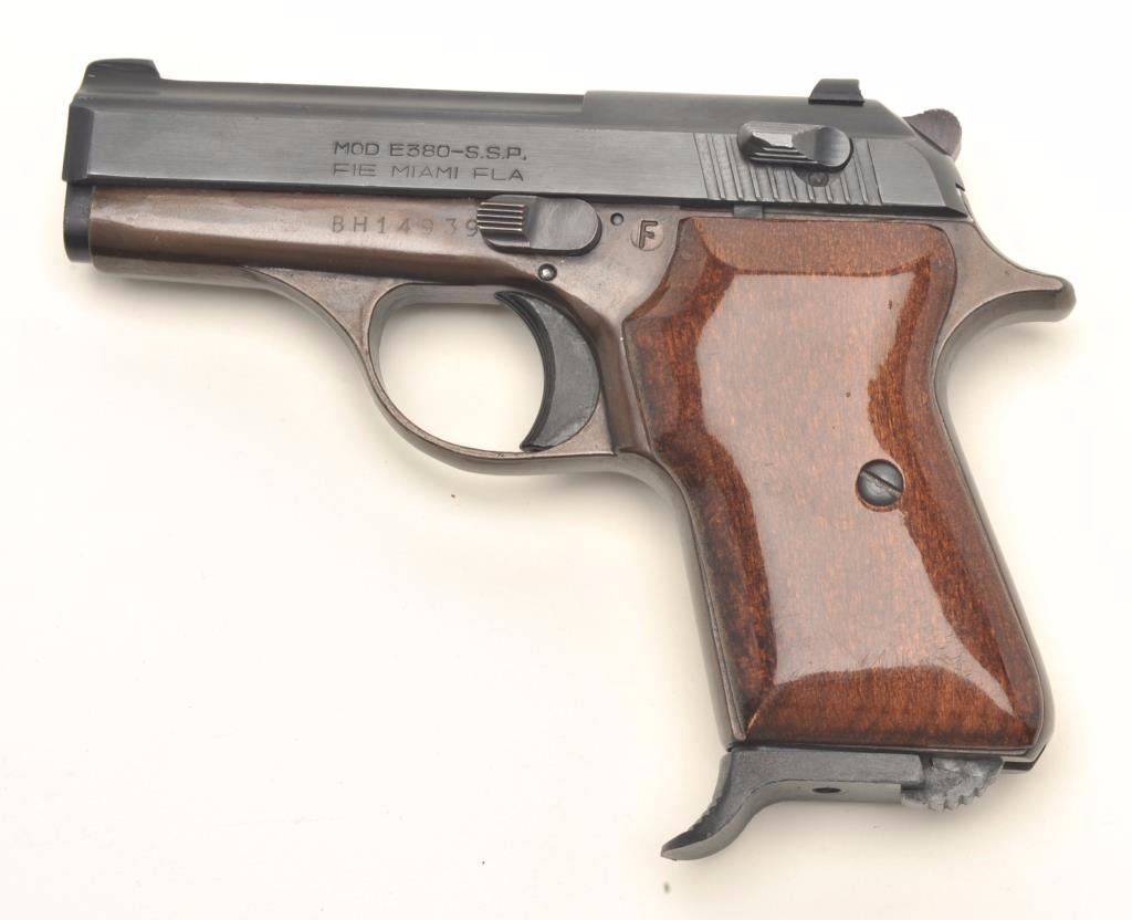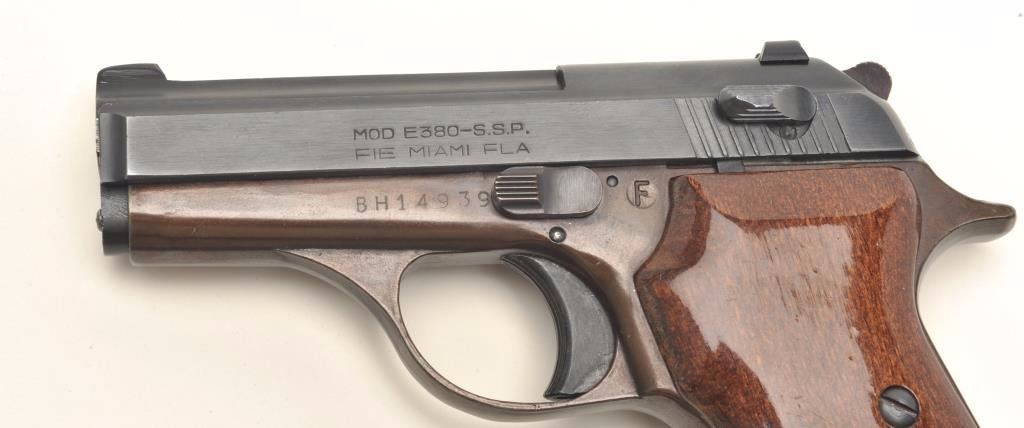 FIE Model E380-SSP semi-automatic pistol, .380 caliber, serial #BH14939. The pistol is in good overall condition with a 3 ¼” barrel. The barrel and slide retain the majority of their blued finish while theframe is a bronze color. The smooth wood grips are in good condition showing use with small mars and scrapes. The bore is good, the action is crisp and the markings are sharp. The pistol comes with one correctmagazine. Est.: $100-$200.