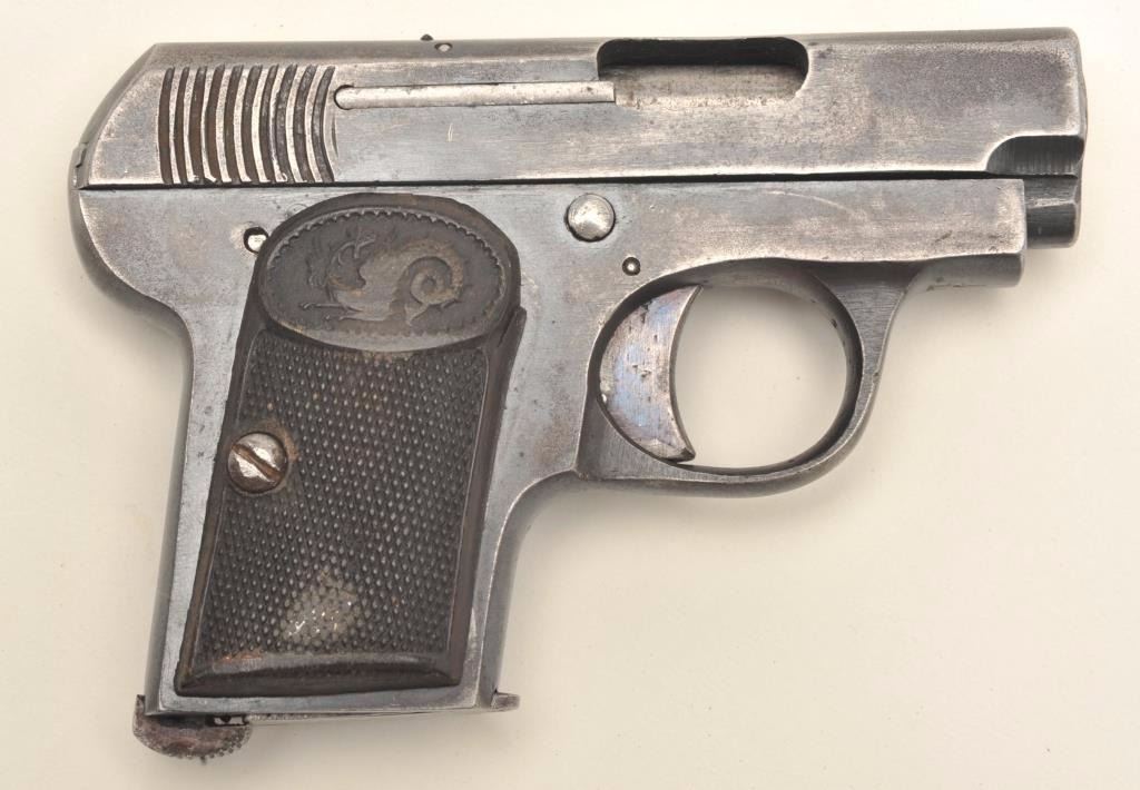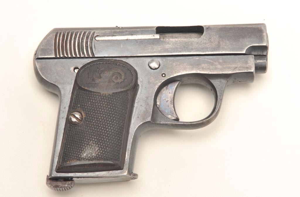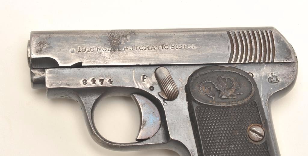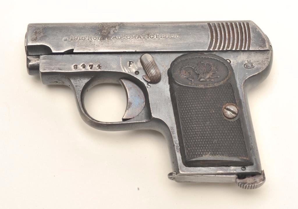 Lot 1413 Eibar Model 1916 semi-automatic pistol, .25 caliber, serial #8474. The pistol is in good overall