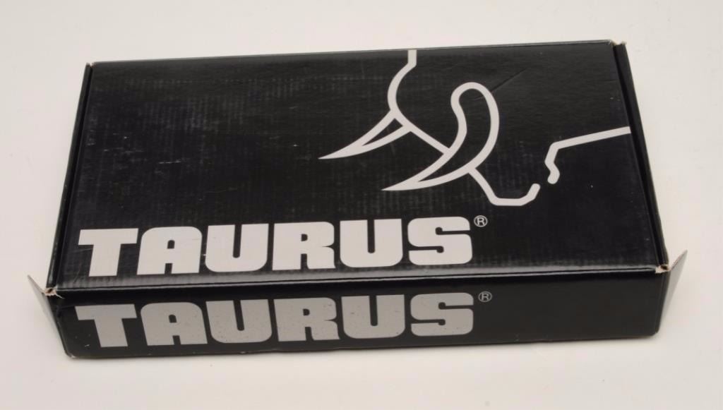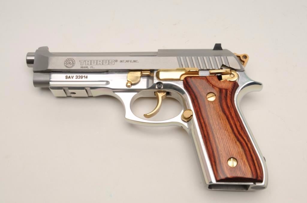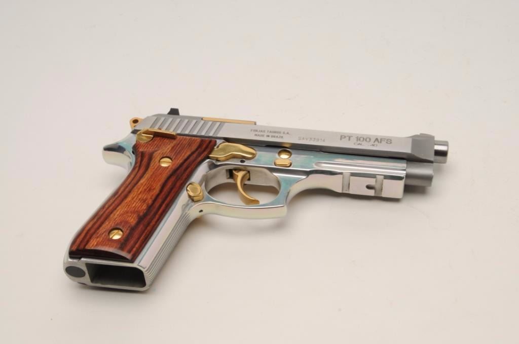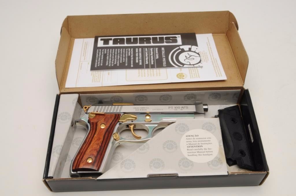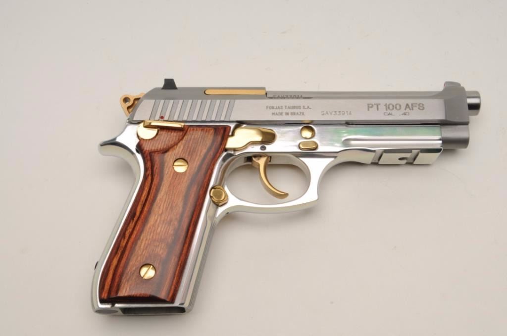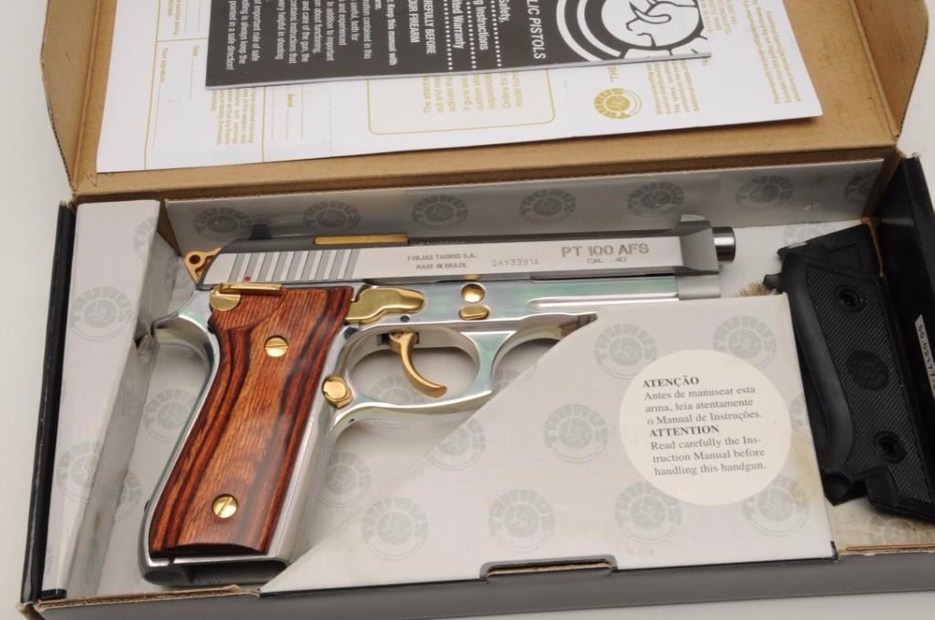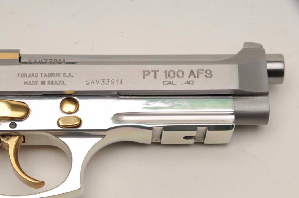 Taurus PT100 AFS Semi-Auto pistol in .40 caliber with a 4 7/8” barrel, stainless steel finish with gold accents and rosewood grips, S/N SAV33914. This pistol remains in excellent condition showing little use andhandling. Original box, operating instructions and original grips included. No mag. (Modern/PPT) Est.: $150-$300