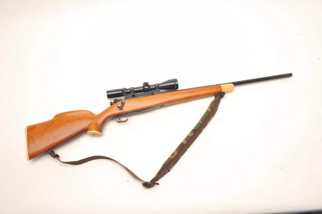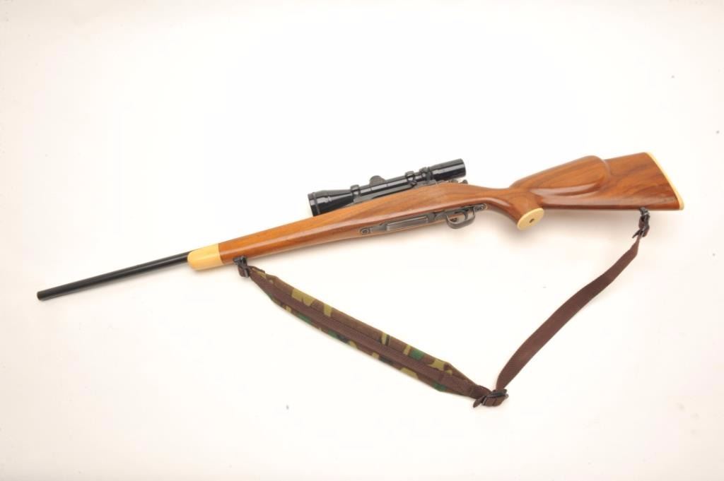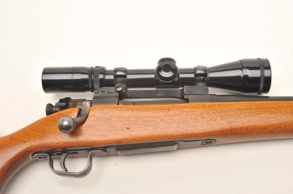 Springfield 03-A3 bolt action rifle, approximately .30 caliber, serial #4752055. The rifle is in good overall condition as sporterized. The 23” barrel retains the majority of its thinning military finish with wear at the muzzle. The receiver also retains a significant amount of its finish with losses at the high points and the magazine cover. The rifle has been re-stocked with a smooth wood sporter stockwith an exaggerated cheek piece which is in good overall condition. The fore end, grip cap and butt plate are all faux ivory. The rifle is topped with a Redfield one-piece mount and Burris 4 x 12 variable power scope. The bore is good, the action crisp and markings are legible. The lot includes sling swivels and a canvas sling. Est.: $150-$300. (C+R).