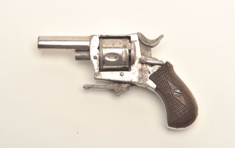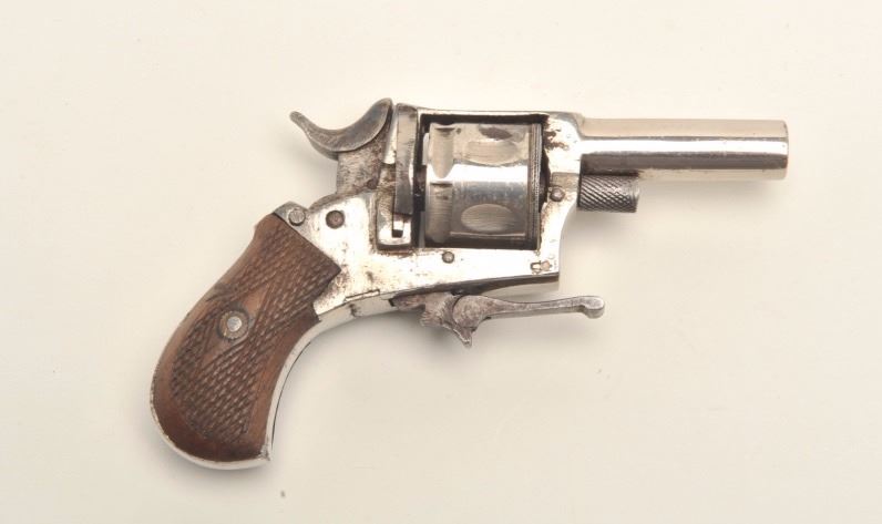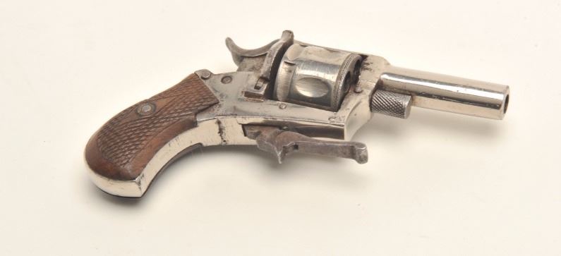 Baby rimfire folding trigger revolver, 5.5mm caliber, 1.75” barrel, nickel finish, checkered wood grips, no visible S/N, in overall good condition displaying the majority of its original finish, good action, no markings, good grips. (Antique). Est.: $100-$200.