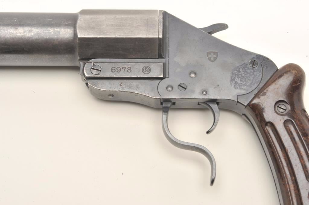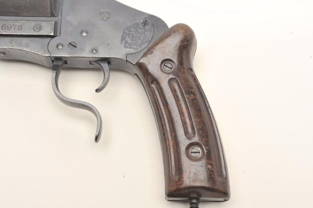 Swiss Racketen M17/38 flare pistol, approximately 15.5” overall, blued finish, composite grip, woven sling, S/N 6978, in overall good + condition with a crisp action, good bore and good grips. Est.:$200-$400.