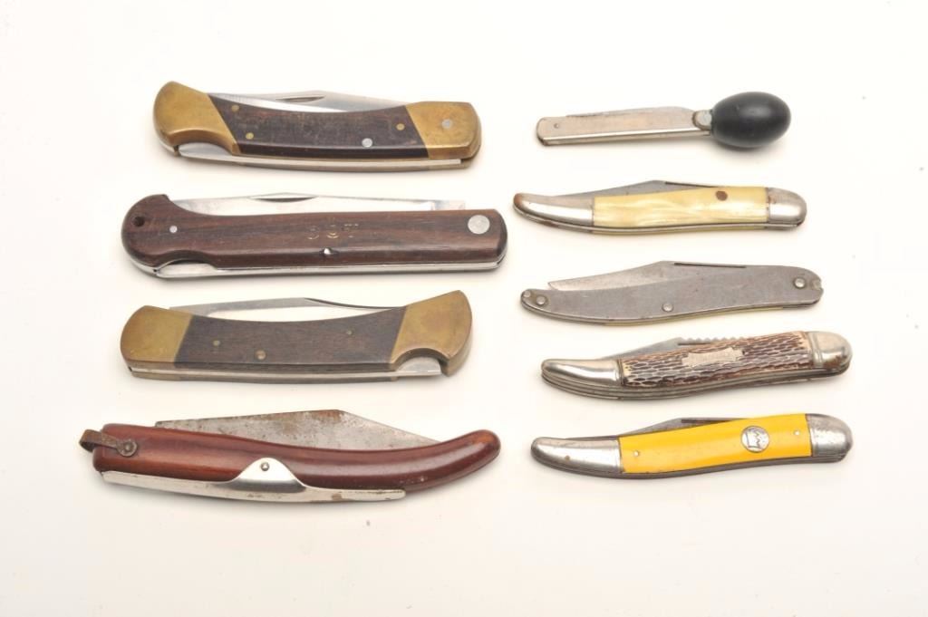 Lot of 9 vintage folding knives including makers Shrade, Walden, Buck, etc.; various condition and ages. Est.: $150-$300.