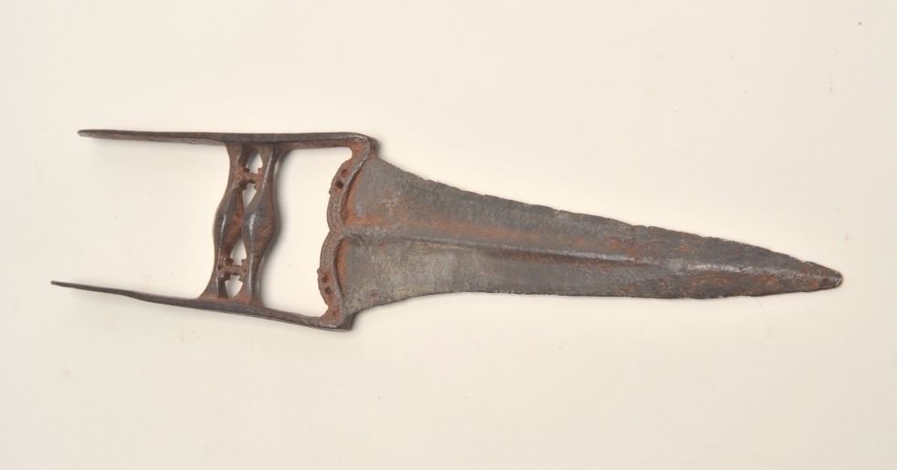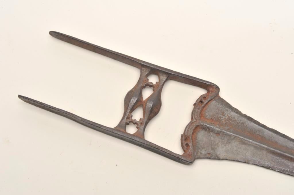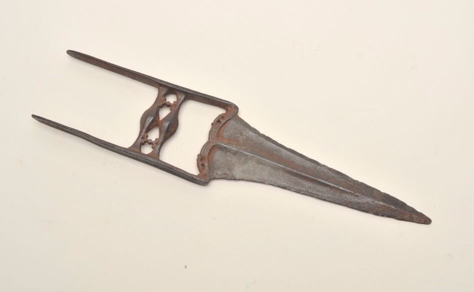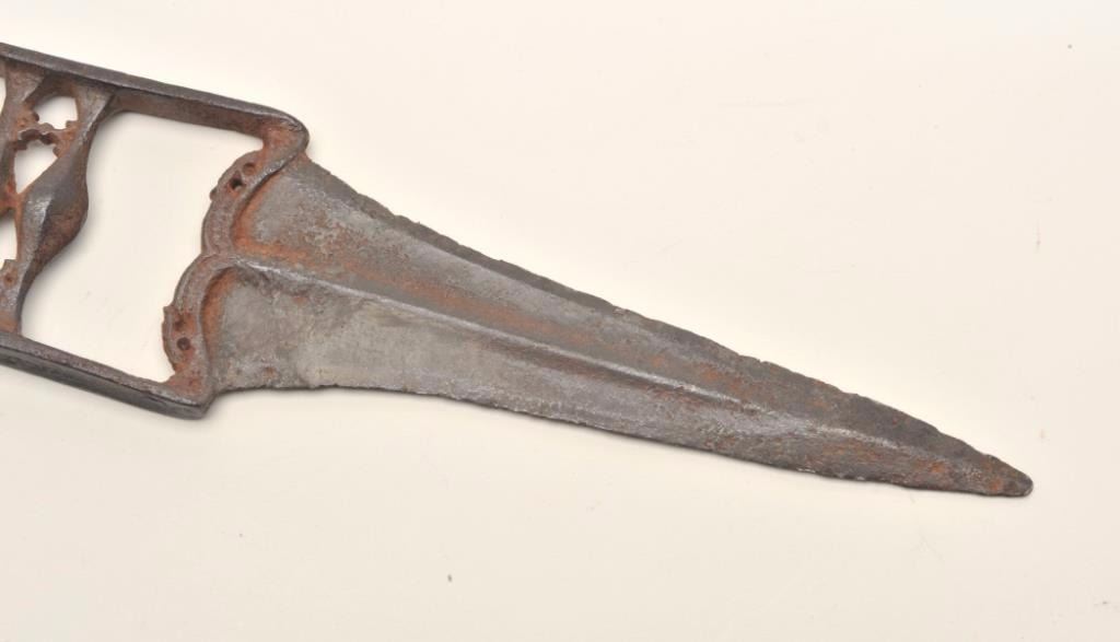 Small 18th to 19th century Qatar. The knife is in good condition with a 6 ¾” blade and an overall length of 12”. The blade is heavily patinated and shows dents and wear along the edges. The knife has ornamentation at thebase and on the handle. Est.: $150-$300.