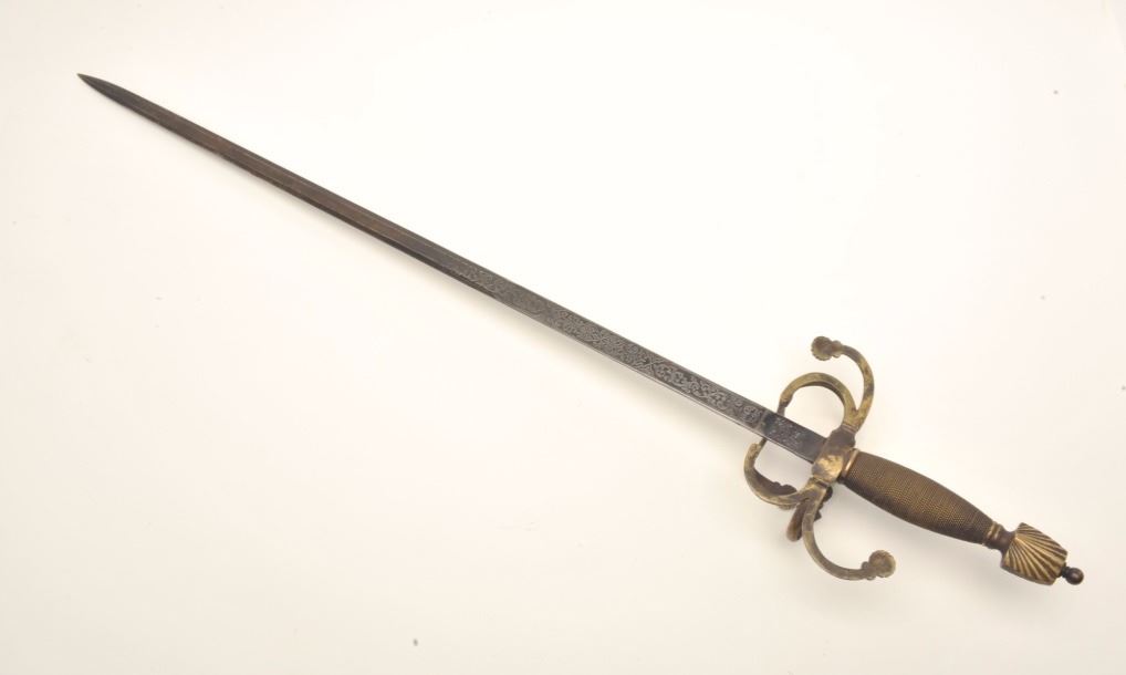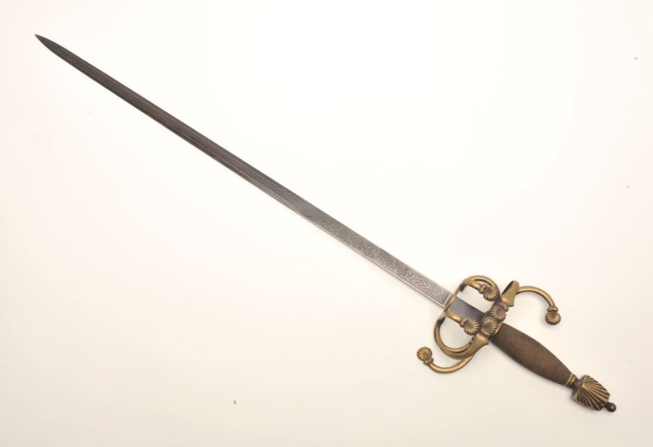 Early 20th century rapier manufactured in the 17th century style. The sword has a 31” etched blade and an overall length of 38”. The blade shows high point edge wear but is otherwise in very good condition and has notbeen sharpened. The scroll etching extends half way down the blade. The hand guard is brass and the grip is wire wrapped with a heavy brass pommel. Est.: $150-$300.