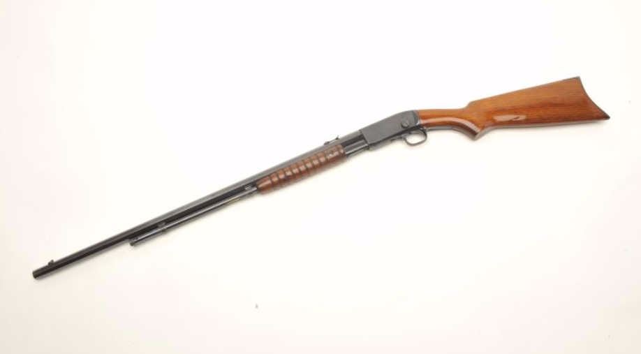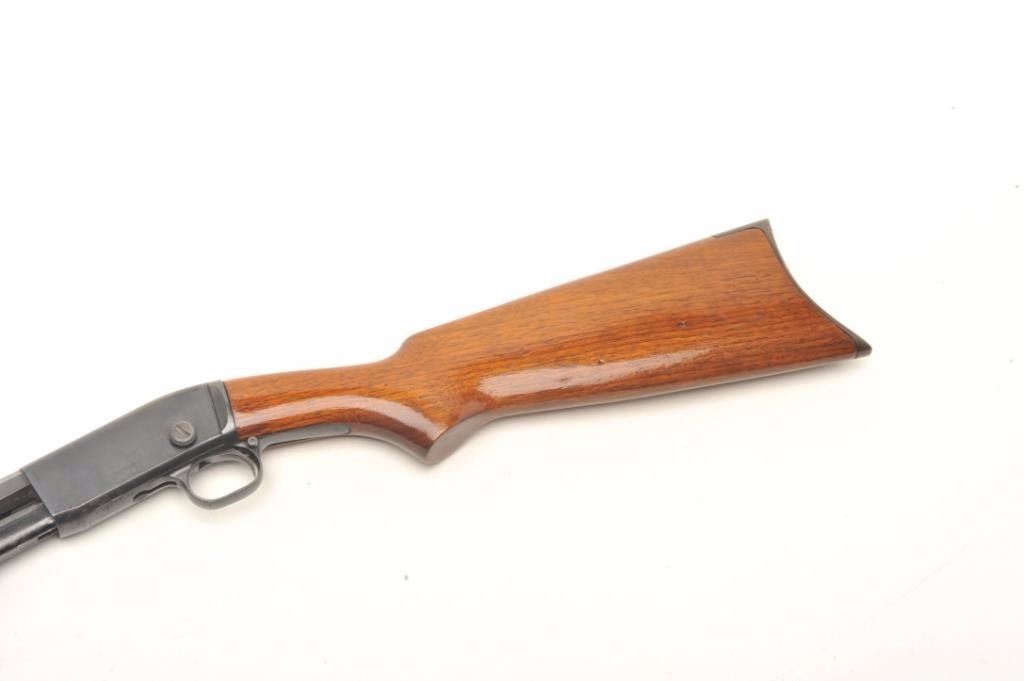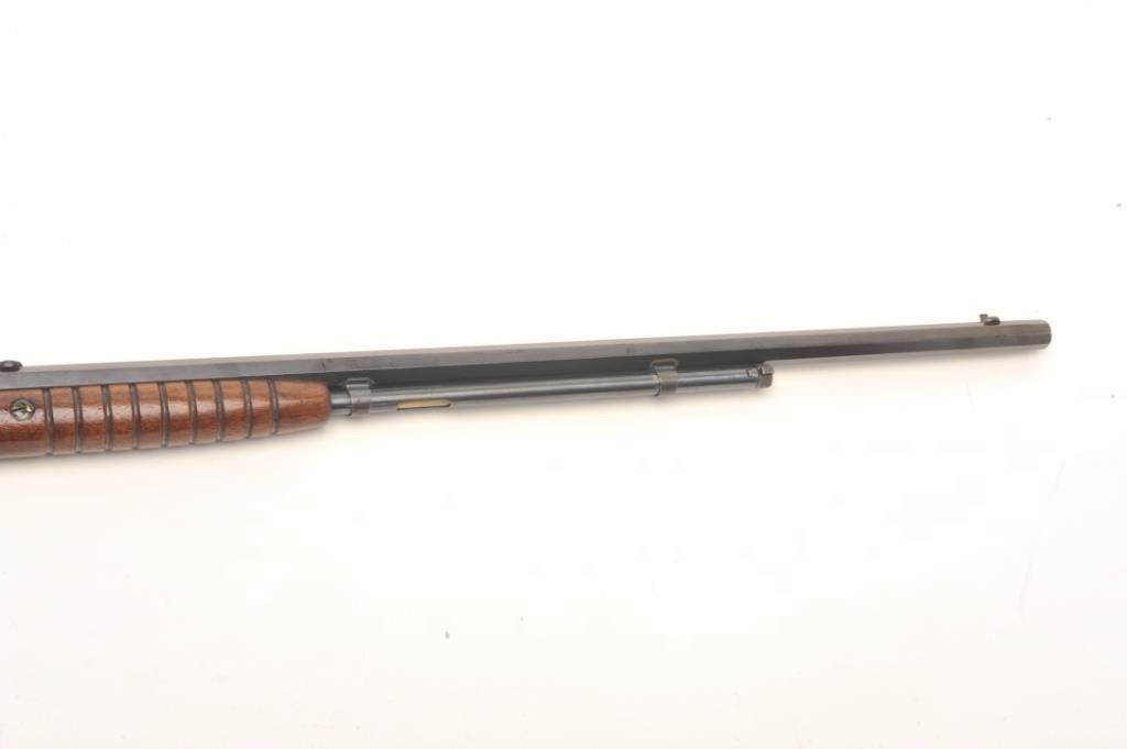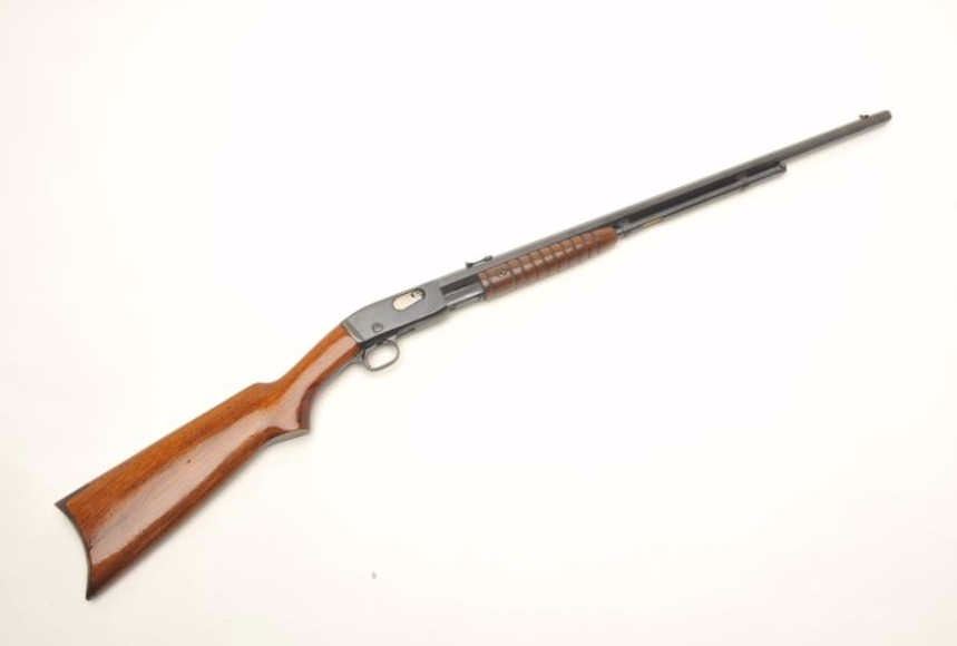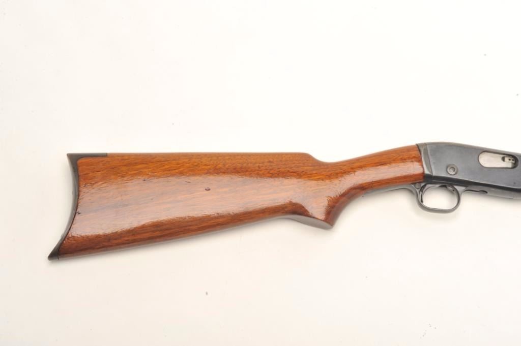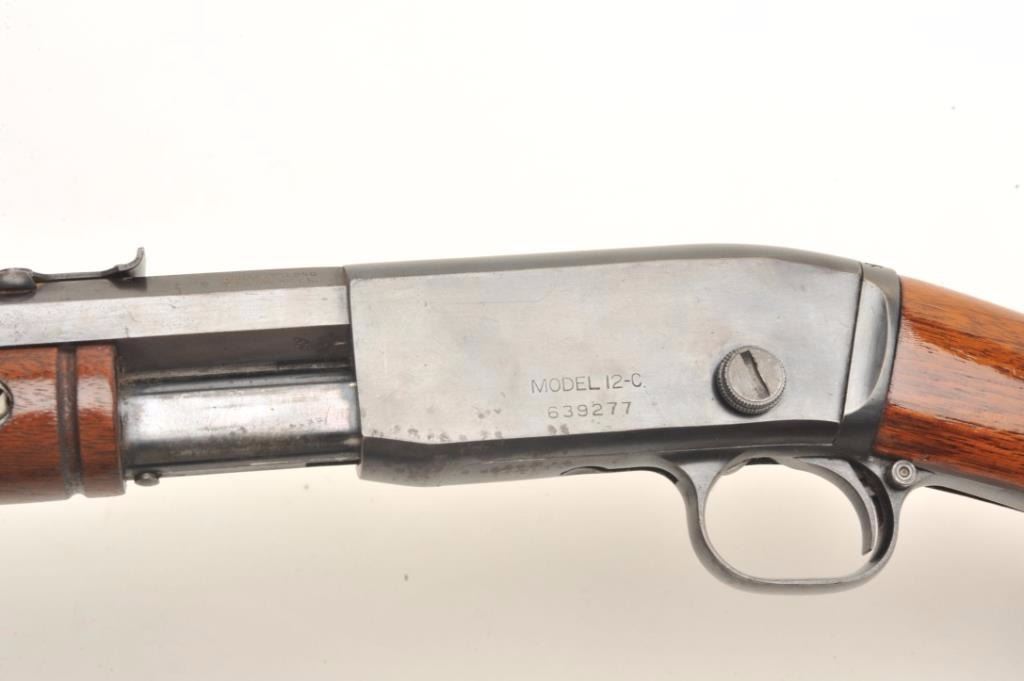 Remington Model 12C takedown pump rifle, .22 Short, Long or Long Rifle caliber, serial #639277. The rifle is in very good overall condition with a 24” octagon barrel with a post front and standard rear sights. Thebarrel and magazine retain the majority of their blued finish with sharp edges and some light surface rust evident. The receiver retains a significant amount of its original blued finish with edge wear and light surface erosion noted. The smooth wood stocks are in very good condition as re-finished. An old coat of varnish has been added during the period of use however, the stock shows only minor handling marks and ends with a smooth,metal crescent butt plate. The bore is good, the action crisp and markings are sharp on this nice Remington. Modern/NO PPT.Est.: $200-$400.