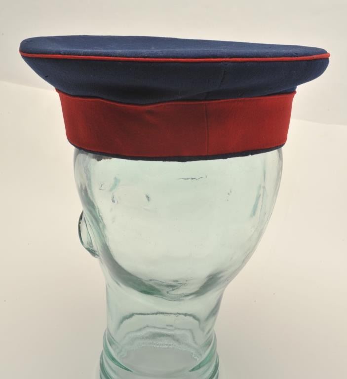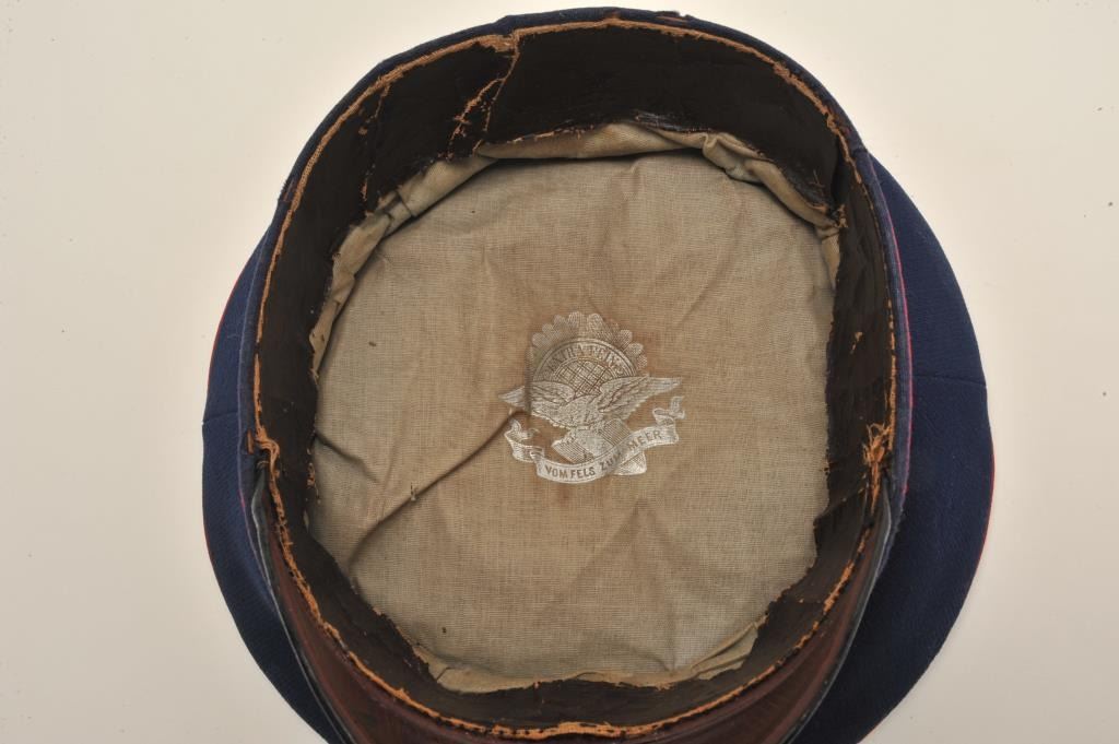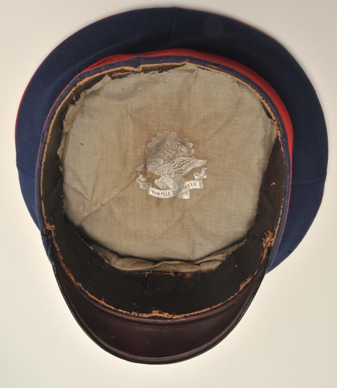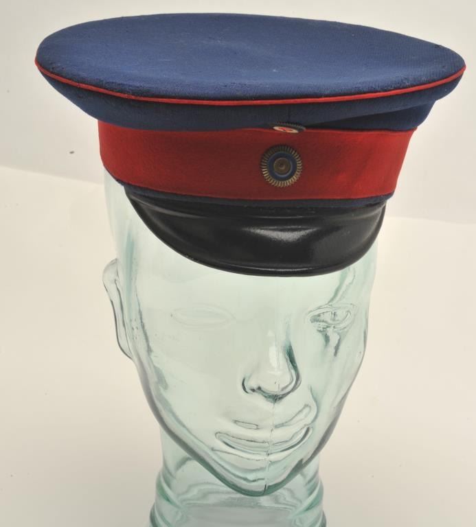 Pre-WW I Bavarian Infantry blue and red cap with black visor in overall good condition with slight mothing. Est.: $200-$400.