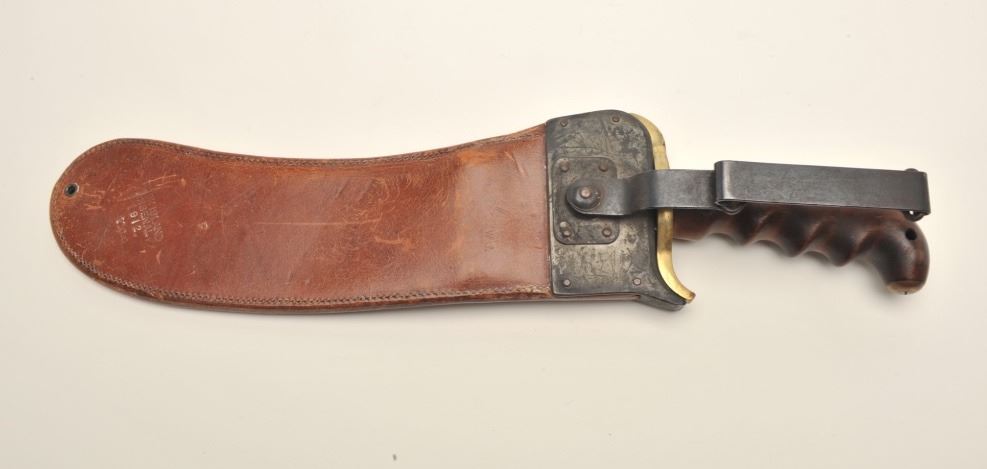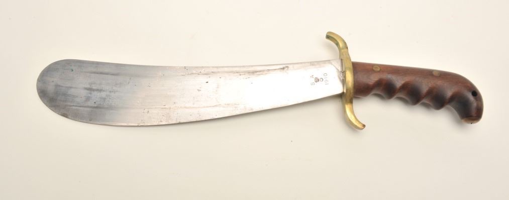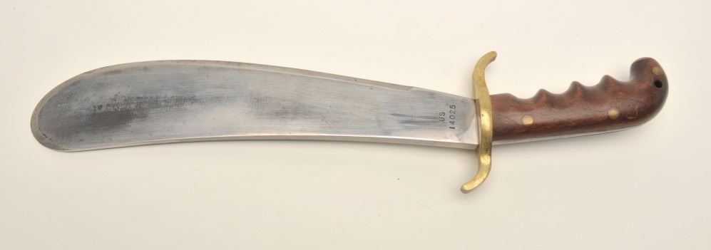 U.S. 1904 Hospital Corps. Bolo Knife with leather sheath and swivel metal hanger, overall very good condition; “US 14025” and “S A (flaming bomb) 1910” markings at base of blade; sheath is stamped “ROCK ISLANDARSENAL /1912/T.C.C.”. Est.: $250-$500.