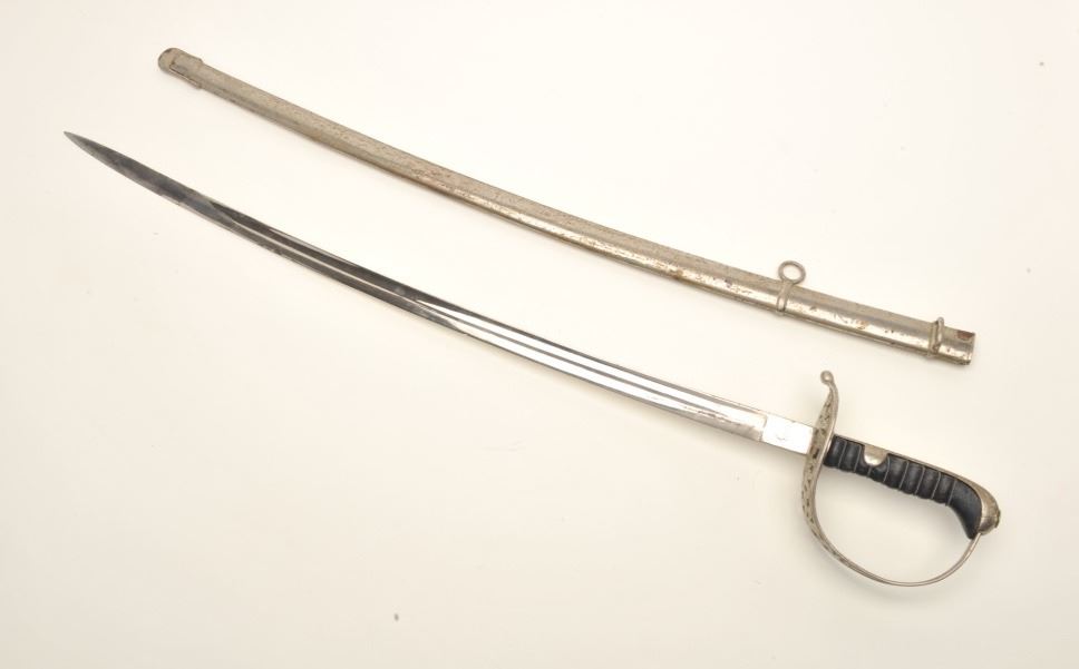 German Officer’s sword signed “Weyersberg & Stamm, Solingen” with metal scabbard, approximately 37” overall with a 29” plain blade; un-cleaned overall with an old dent on the right side of scabbard at drag. Est.: $150-$300.