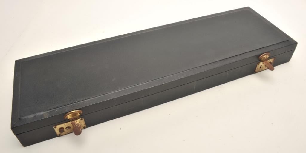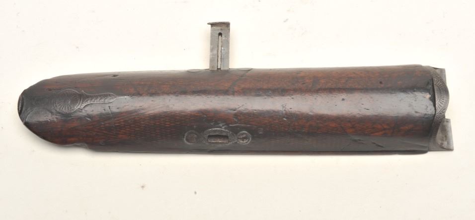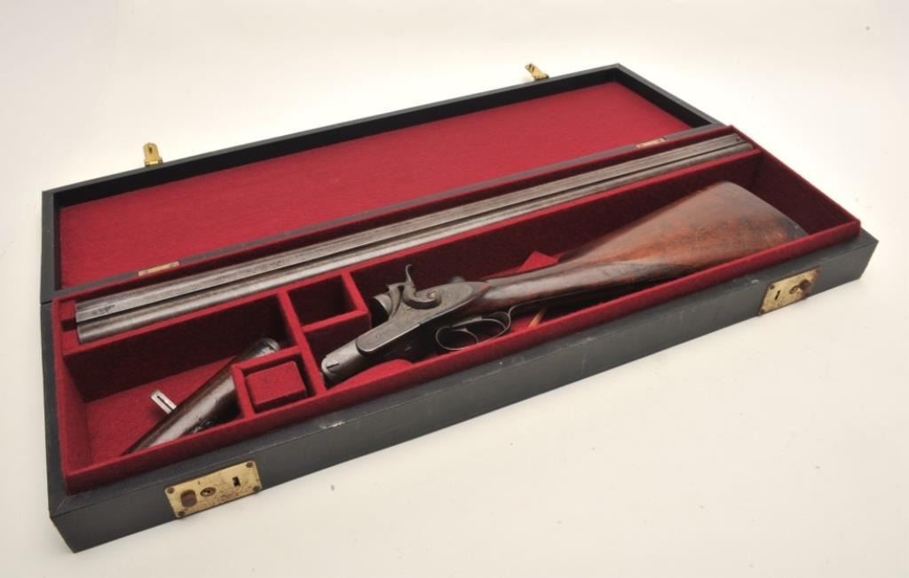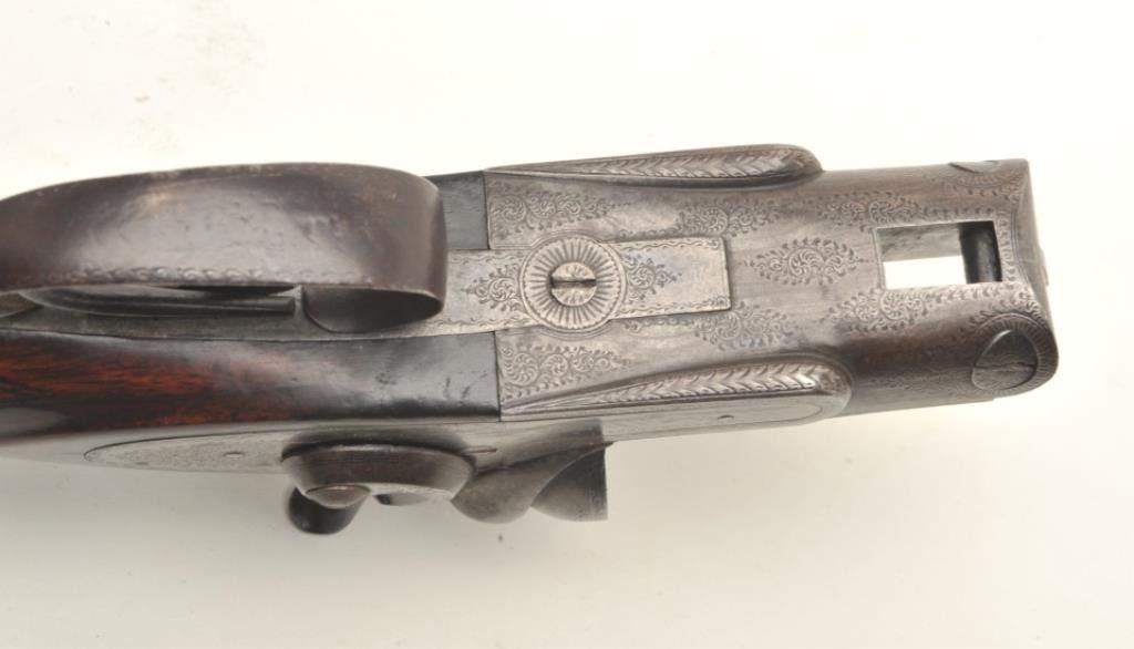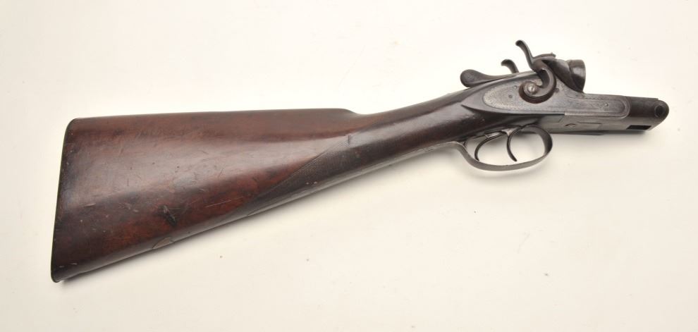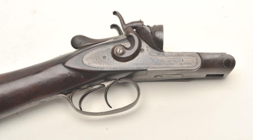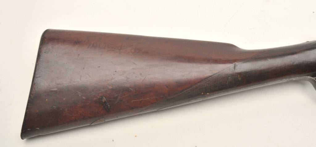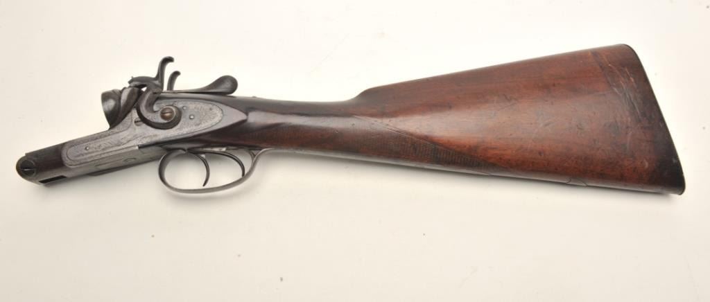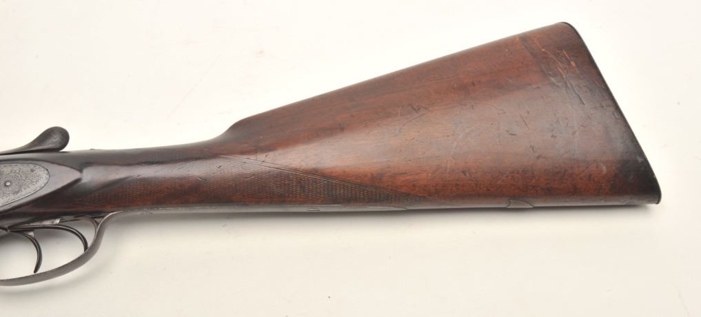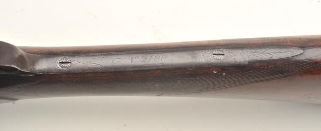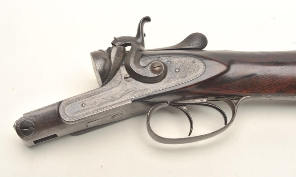 J. P. Clabrough & Bros. English SxS shotgun, 10 gauge, 28” damascus barrels, checkered wood stocks, S/N 2188, in overall good condition with crisp actions, period engraving on receiver with game scenes, bores display scattered areas of erosion and pitting, wood stocks are overall good showing even wear from lots of use and carry, some scattered mars and scratches, again from carry and from storage. Contained in a later made partitioned hard case (ca. 1960’s-70’s). Clabrough was a respected maker of quality shotguns. (Antique). Est.: $1,850-$3,700.