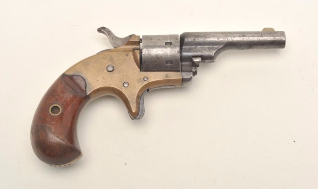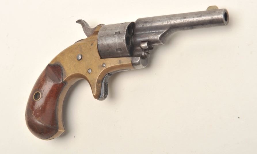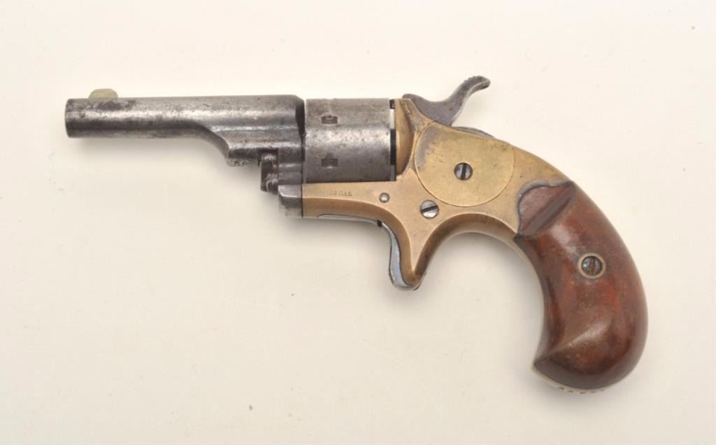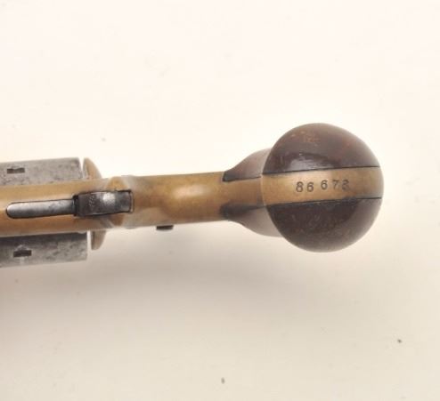 Lot 1479 Colt 1872 Open Top spur trigger revolver, .22 caliber, 2.5” barrel, brass frame, blued finish, woo