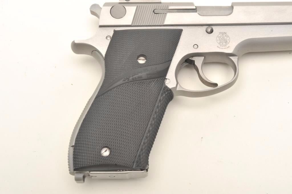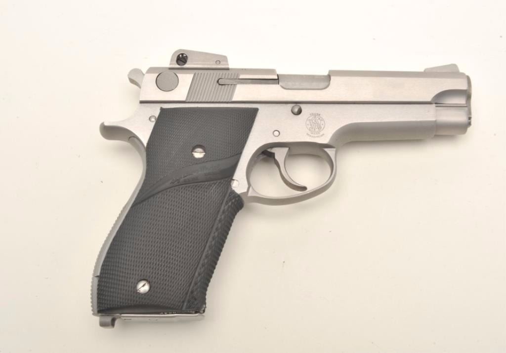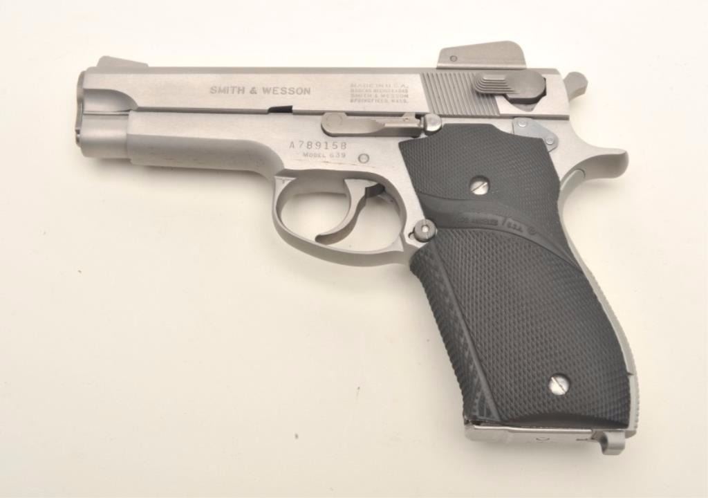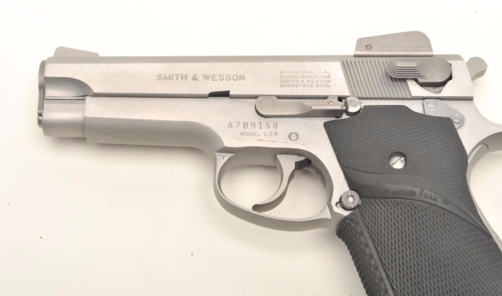 Smith & Wesson Model 639 DA semi-automatic pistol, 9mm caliber, 4” barrel, stainless steel, checkered Pachmayr hard rubber wrap around grips, S/N A789158, in overall fine condition with a fine bore, crisp action,sharp markings and fine grips. (Modern/PPT). Est.: $350-$700.