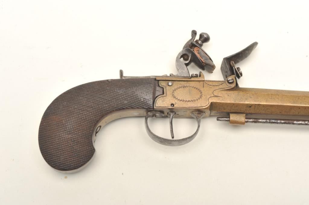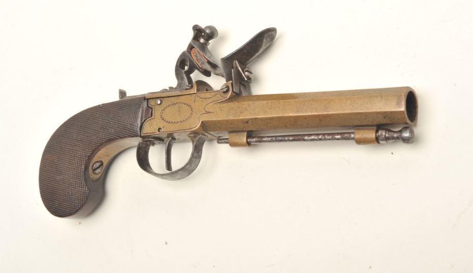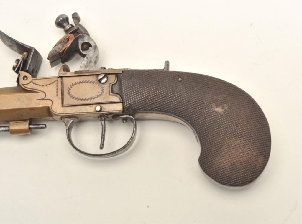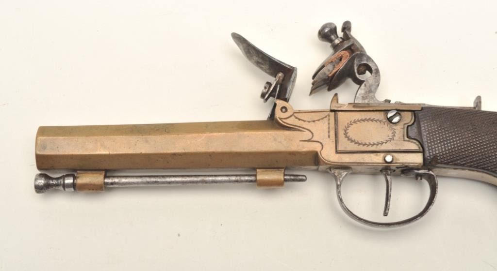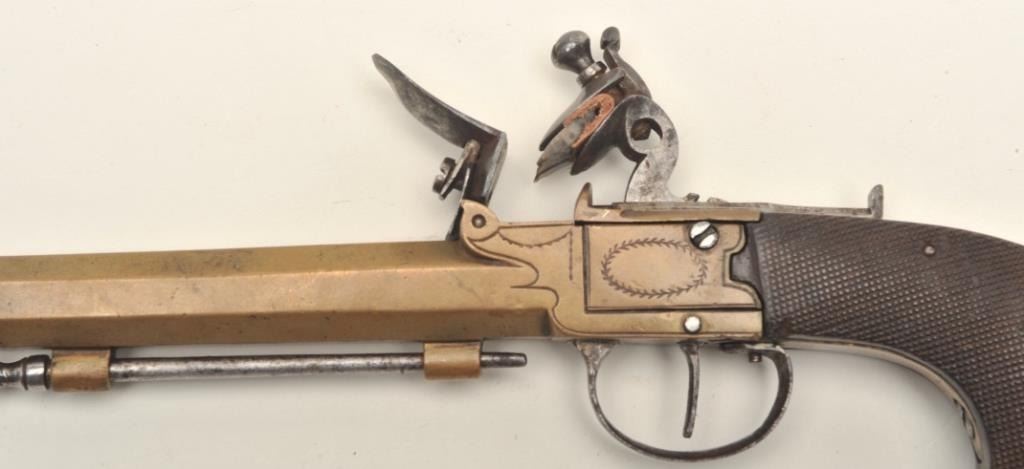 Lot 1489 Flintlock brass single shot French pistol, .54 caliber, 4.5” octagon barrel, checkered wood grips,