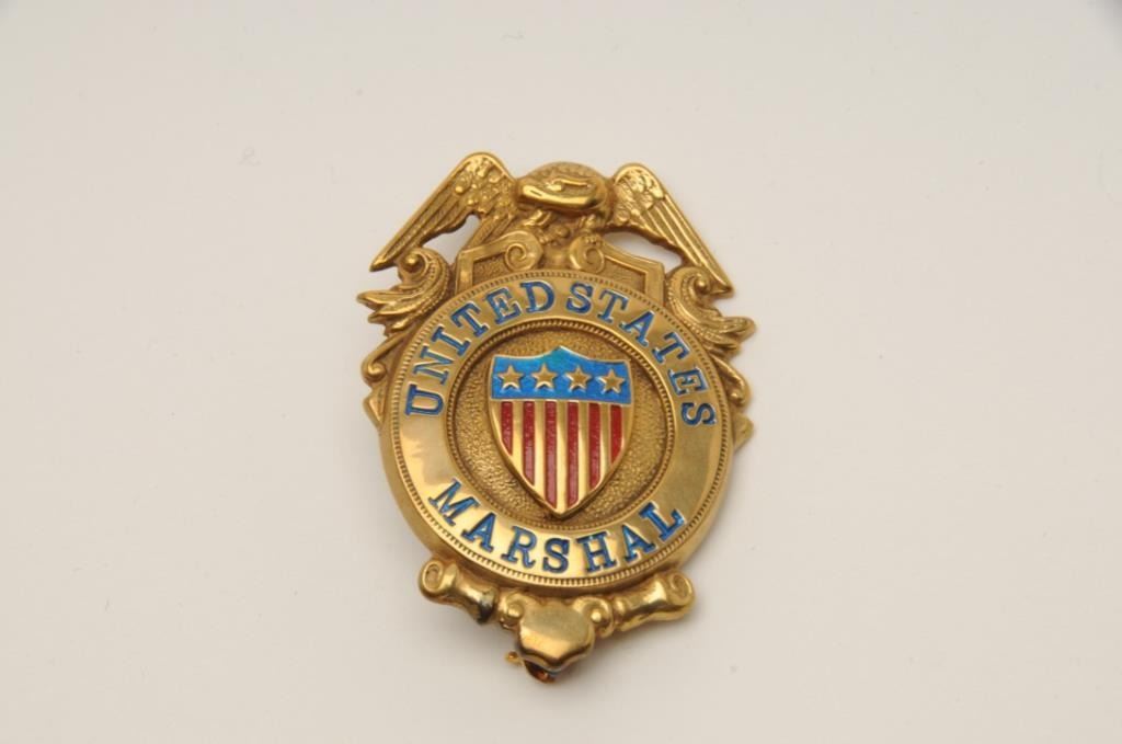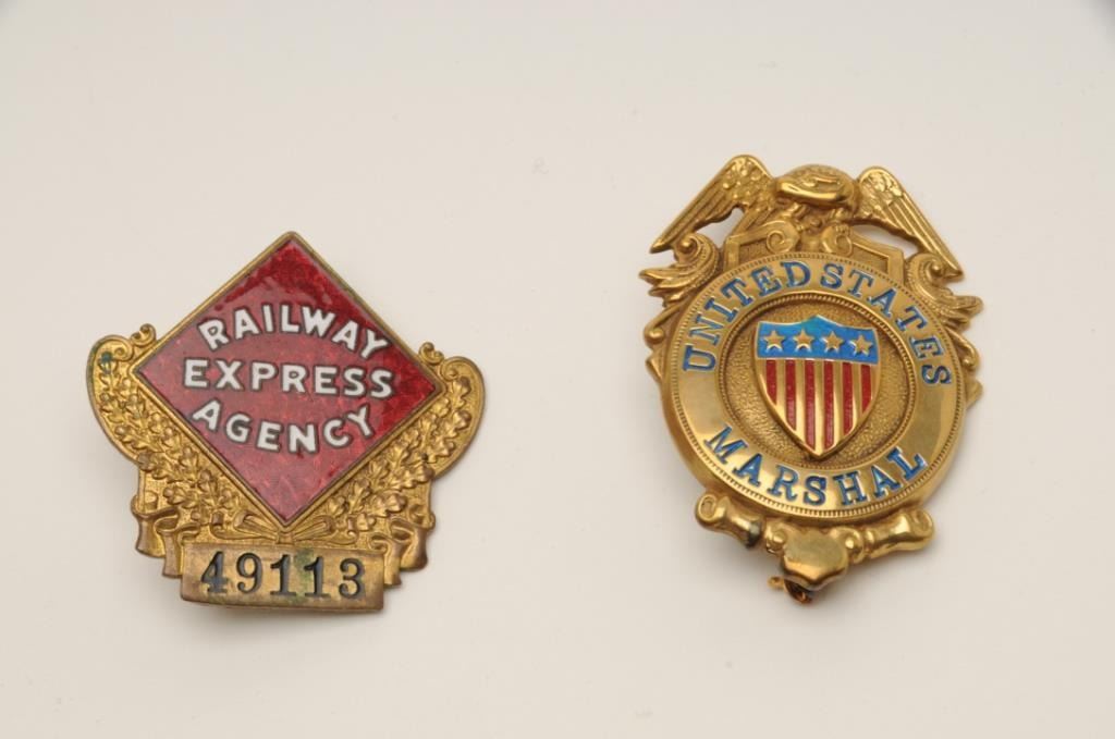 Vintage U.S. Marshal badges showing two color enamel with Railway Express hat badge two color enamel. Est.: $300-$600