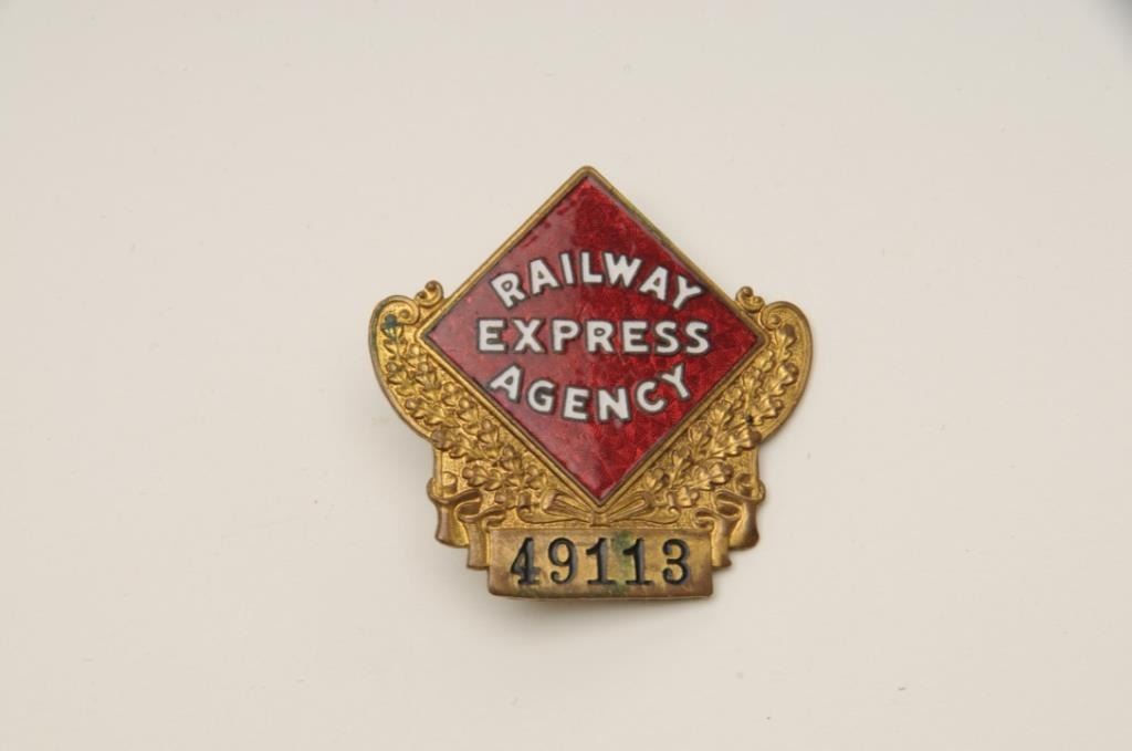 Lot 1492 Vintage U.S. Marshal badges showing two color enamel with Railway Express hat badge two color enam