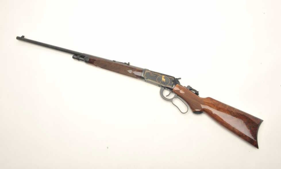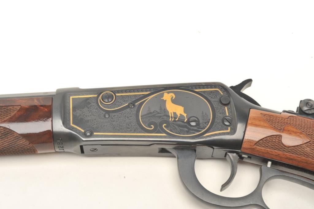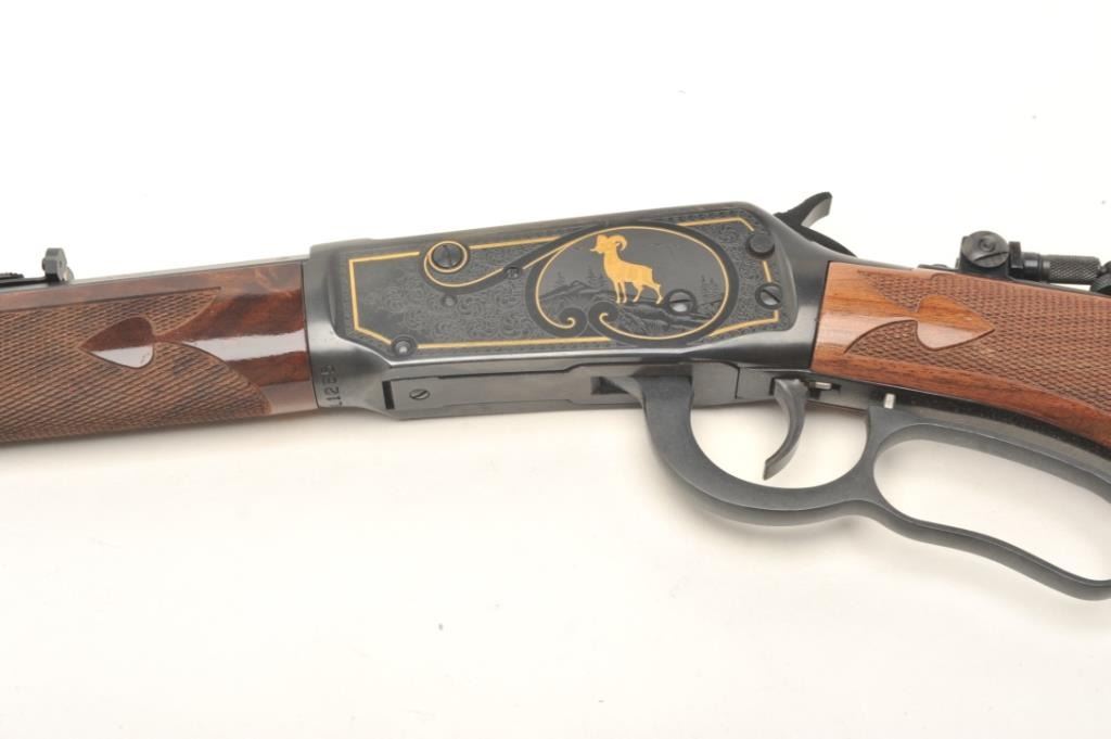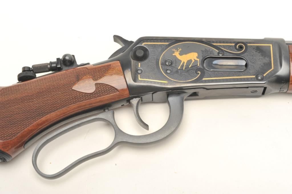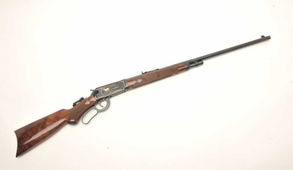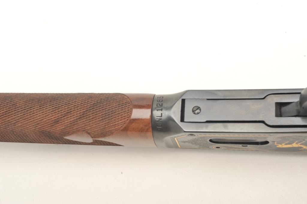 Winchester 1894-1994 Centennial Model lever action rifle, .30 WCF caliber, serial #CNL1265. The rifle is in very good overall condition with a 26” half octagon barrel. The barrel retains nearly all of its bluedfinish. The engraved receiver is inlaid with gold tone game scenes on both sides. A Lyman tang sight has been added. The finely checkered stocks show beautiful figure and finish with extensive checkering and a highgloss finish. The stocks show little wear although there is a ¼” chip on the right side of the fore end. The bore is excellent, the action crisp and markings are sharp. The rifle comes with the original box. Est.:$1,250-$2,500. (Modern).