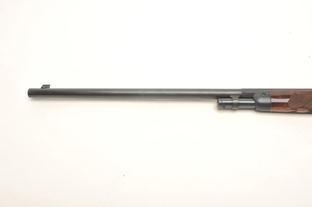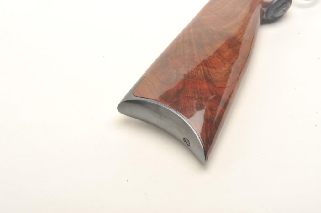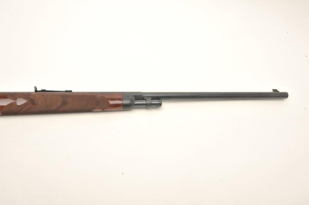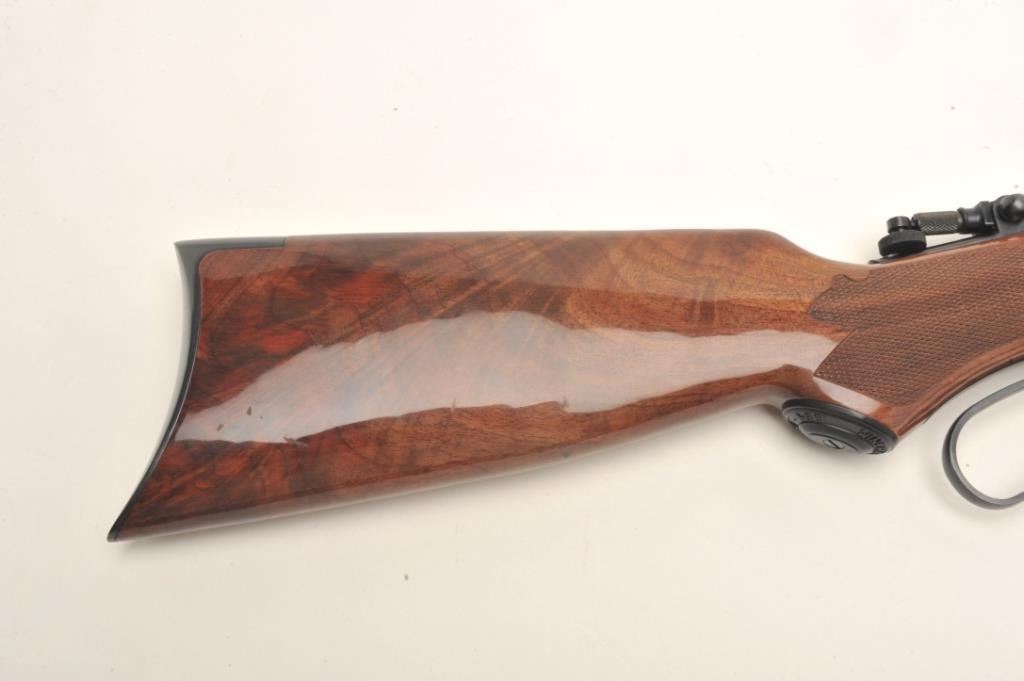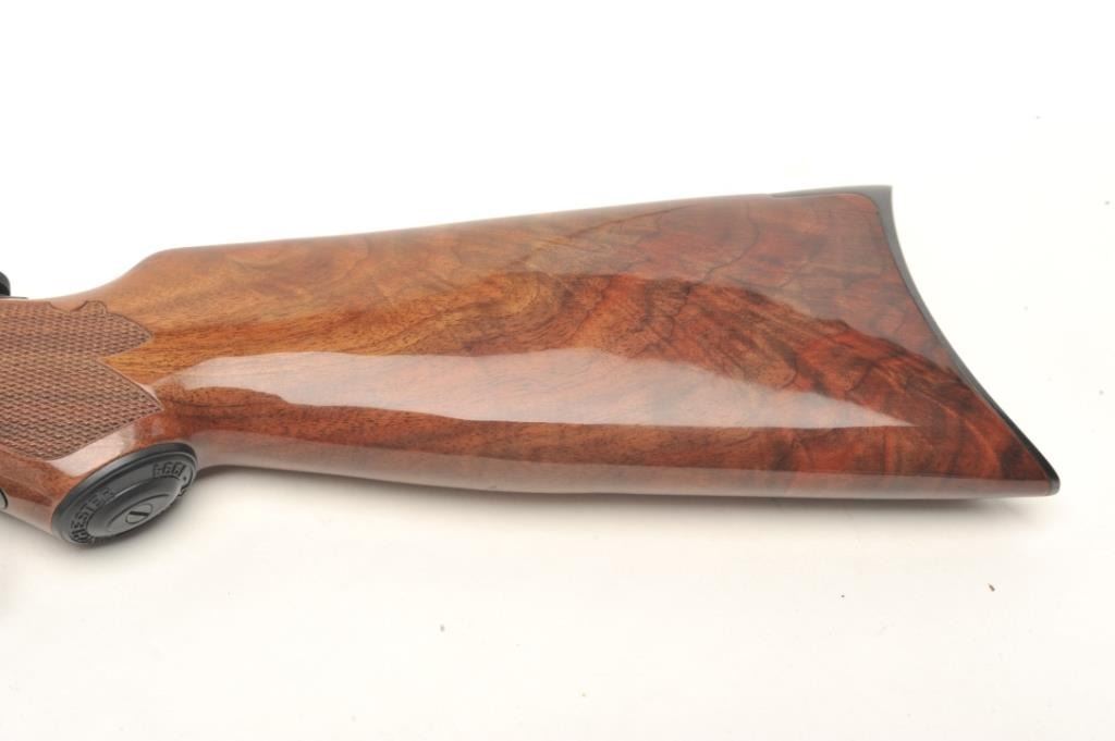 Winchester 1894-1994 Centennial Model lever action rifle, .30 WCF caliber, serial #CNL1265. The rifle is in very good overall condition with a 26” half octagon barrel. The barrel retains nearly all of its bluedfinish. The engraved receiver is inlaid with gold tone game scenes on both sides. A Lyman tang sight has been added. The finely checkered stocks show beautiful figure and finish with extensive checkering and a highgloss finish. The stocks show little wear although there is a ¼” chip on the right side of the fore end. The bore is excellent, the action crisp and markings are sharp. The rifle comes with the original box. Est.:$1,250-$2,500. (Modern).