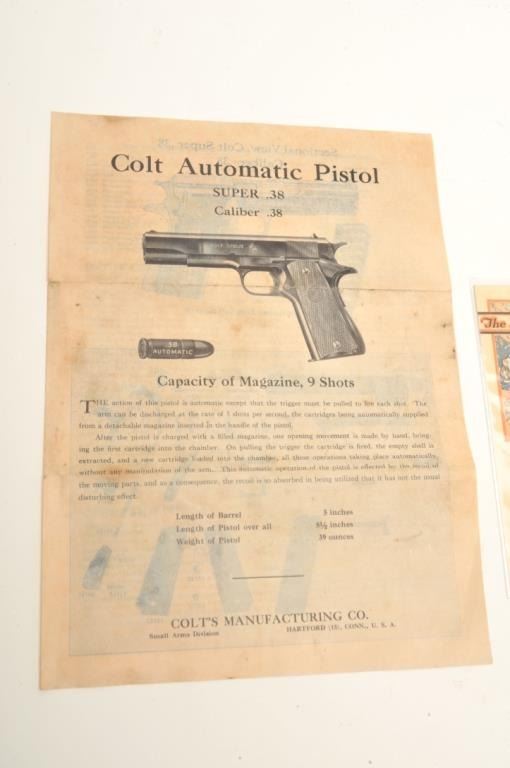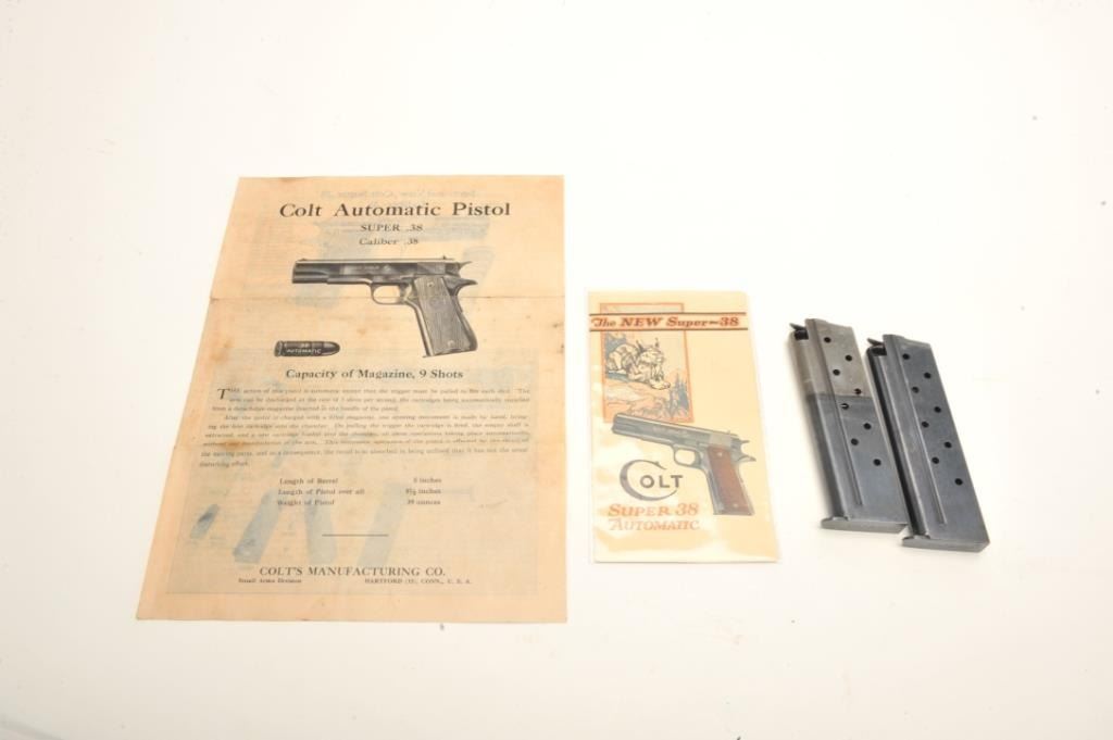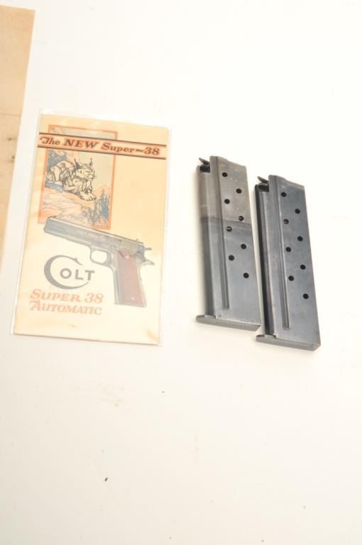 Lot of Colt .38 Super accessories including 2 magazines (one is a two-tone), a Super .38 instruction sheet and a Colt Super .38 advertising pamphlet. Est.: $50-$100.
