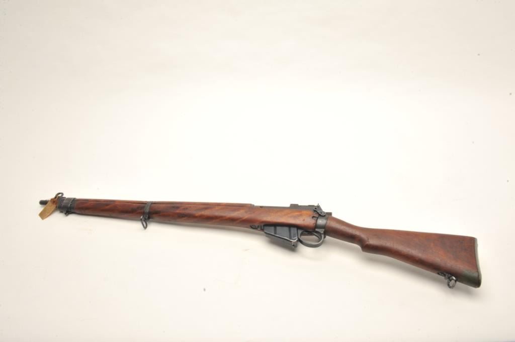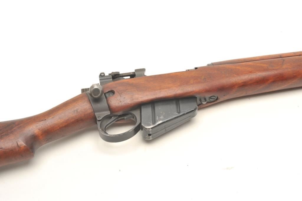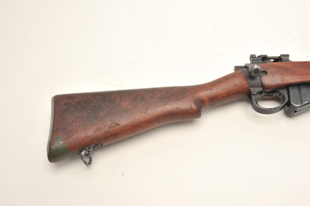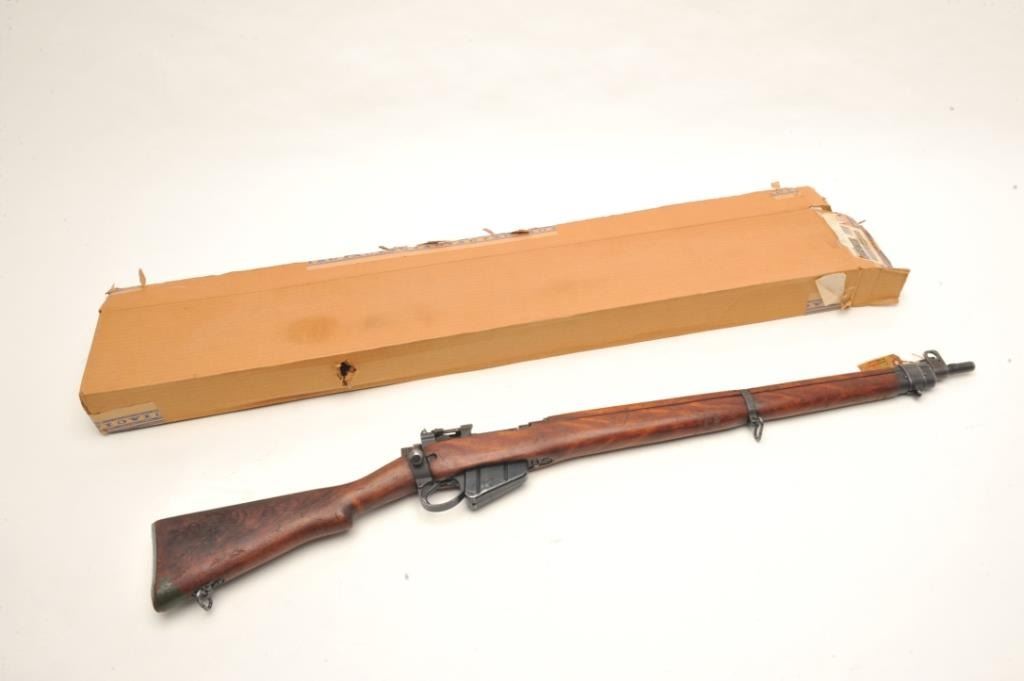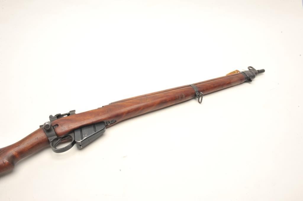 Savage Enfield No. 4 Mk. 1 bolt action rifle, .303 British caliber, serial #OC62545. The rifle is in very good overall condition with a 25” barrel. The rifle retains the majority of its military finish with high point edgewear consistent with service use. The rifle features a military tangent style rear sight and the receiver is marked,” U.S. PROPERTY”. The smooth wood stock is in good condition showing mars, compressions consistent withuse and several small cartouche marks. The butt stock ends with a smooth metal butt plate with trap. The bore is fair, the action crisp and markings are sharp. The lot includes the original shipping box andassociated paperwork. Est: $150-$300. (C+R).