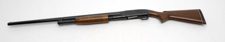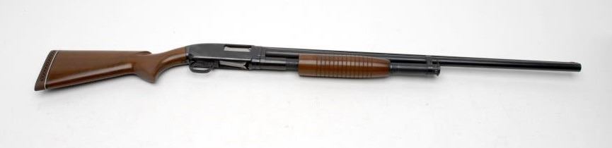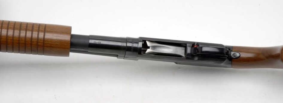 Winchester Model 12 pump shotgun, 12 gauge, serial #1900164, The shotgun is in nearly excellent overall condition with a 30” barrel with a hi-viz front sight and full-length ventilated rib. The barrel and receiverretain nearly all of their original blued finish. The consigner states that he sent the shotgun to Simmons Gun Specialties of Kansas City, Mo for installation of the rib and it is marked as such. The smooth woodstocks are in overall very good condition showing only slight handling marks. The butt stock has had a White Line ventilated rubber pad added creating a 14” LOP. The bore is excellent, the action crisp and the markingsare sharp. The consigner states that he purchased the shotgun from Montgomery Wards in 1960 by making payments. It has remained with him since. A real clean Model 12. Est.: $500-$1,000. (C+R).