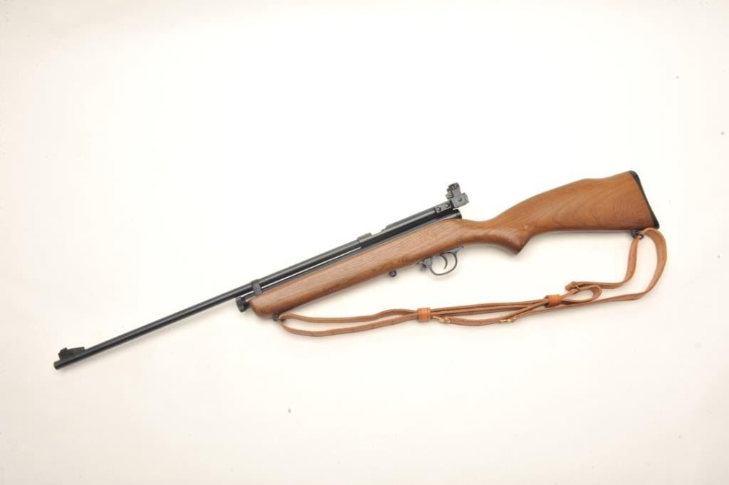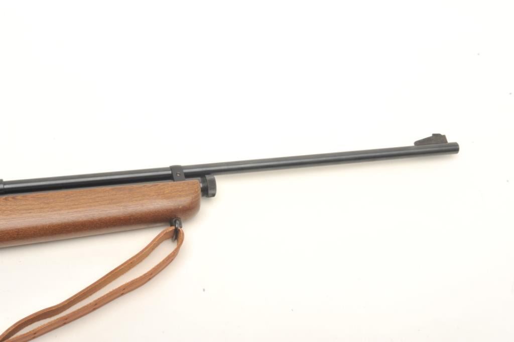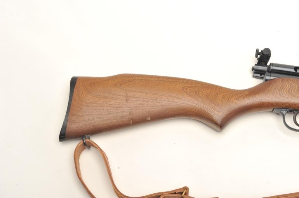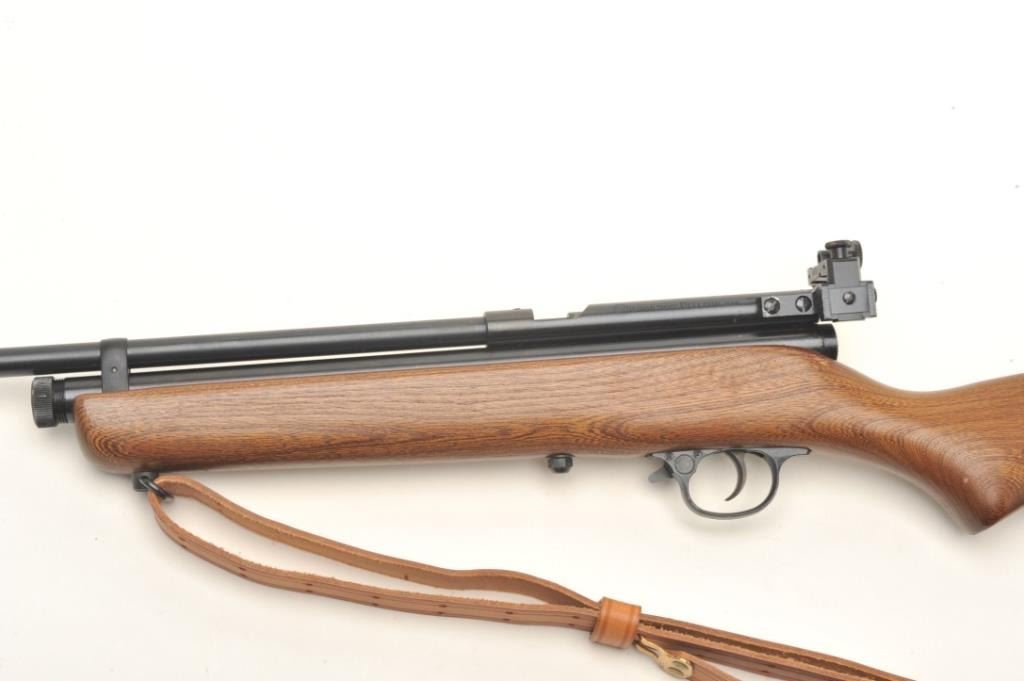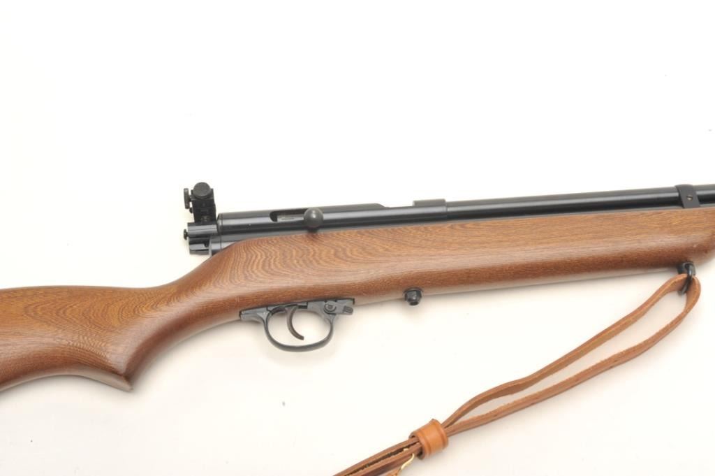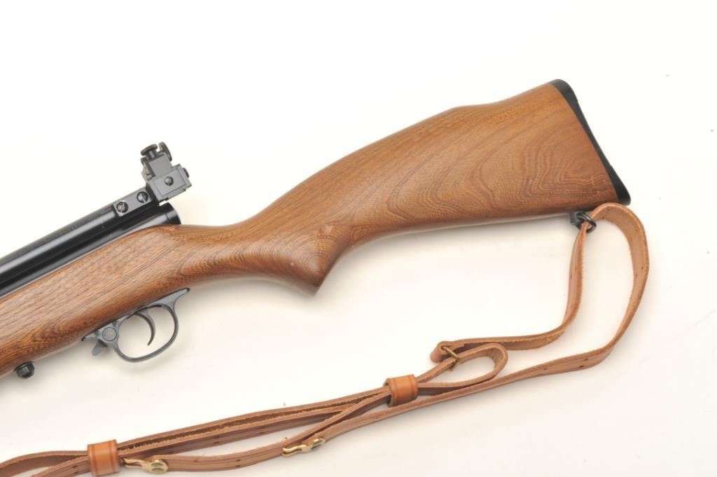 Crosman Model 160 CO2 pellet rifle, .22 caliber, serial #NSNV. The rifle is in very good overall condition with a 24” barrel. The barrel and receiver retain nearly all of their blued finish with only minor wearnoted. The rifle features an aperture sight mounted at the rear of the action. The smooth wood stock is in good condition with small scrapes and dents consistent with use. The bore is good, the action appears tofunction and the markings are sharp. The lot includes a leather military style sling. Est.: $50-$100.
