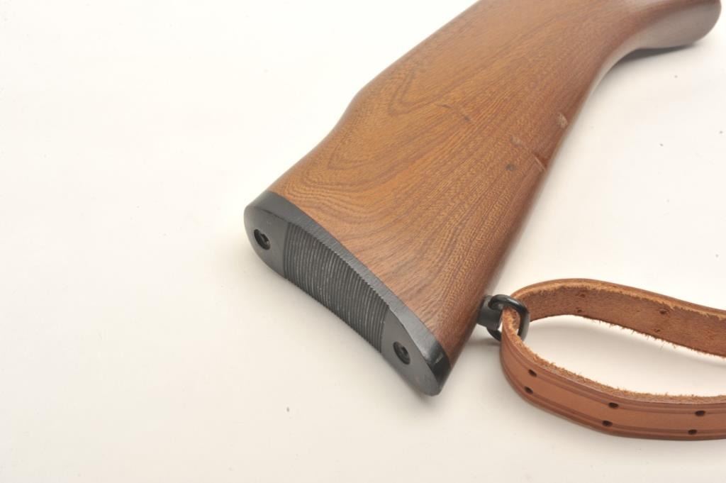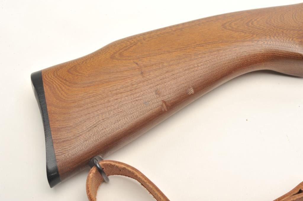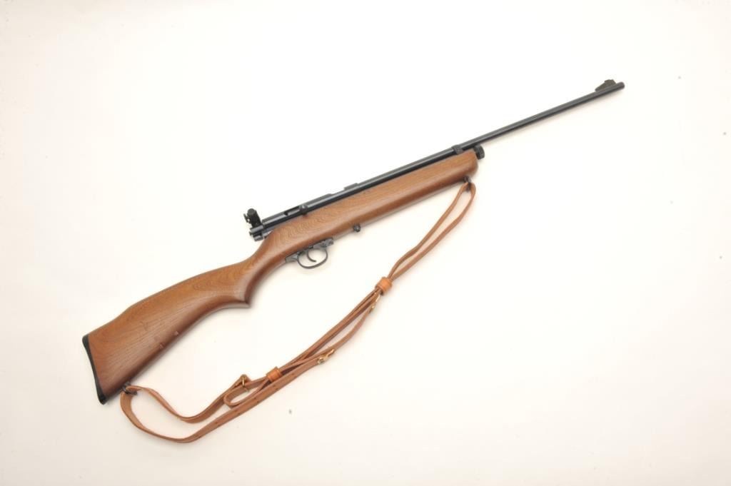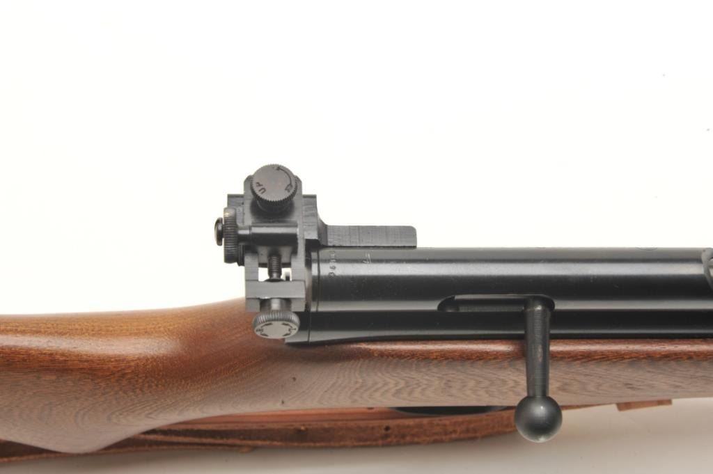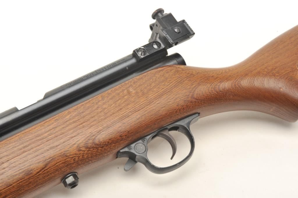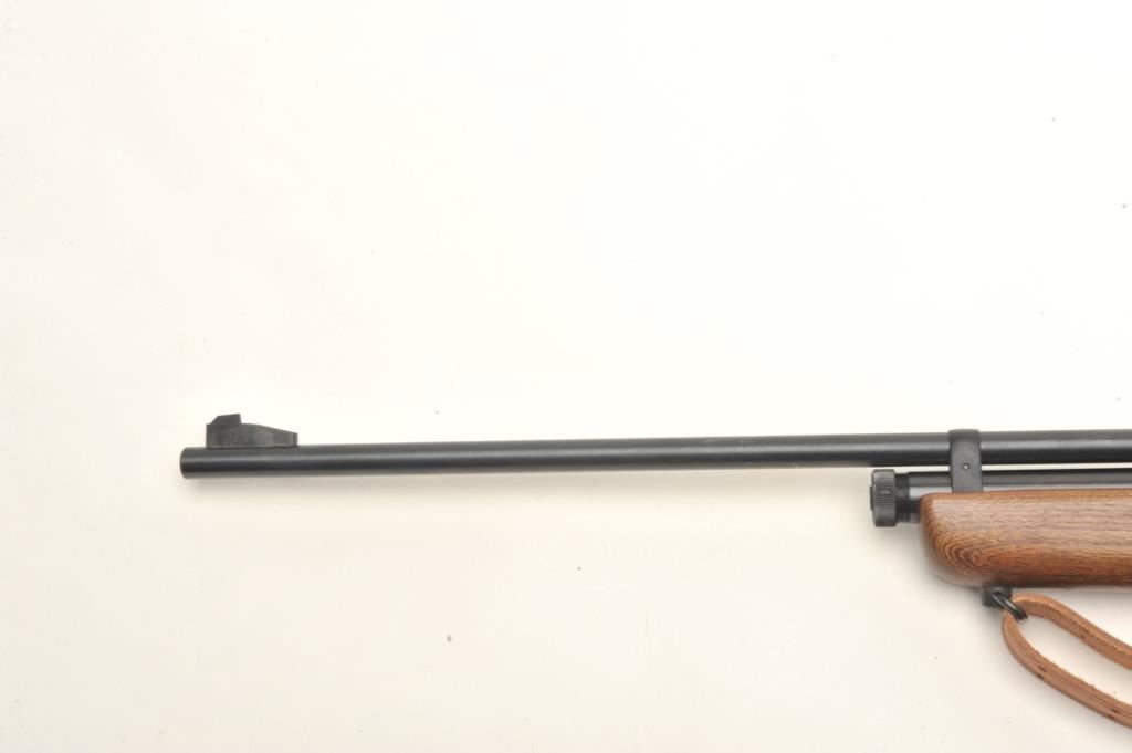Crosman Model 160 CO2 pellet rifle, .22 caliber, serial #NSNV. The rifle is in very good overall condition with a 24” barrel. The barrel and receiver retain nearly all of their blued finish with only minor wearnoted. The rifle features an aperture sight mounted at the rear of the action. The smooth wood stock is in good condition with small scrapes and dents consistent with use. The bore is good, the action appears tofunction and the markings are sharp. The lot includes a leather military style sling. Est.: $50-$100.