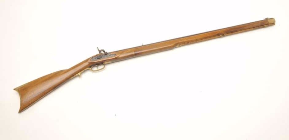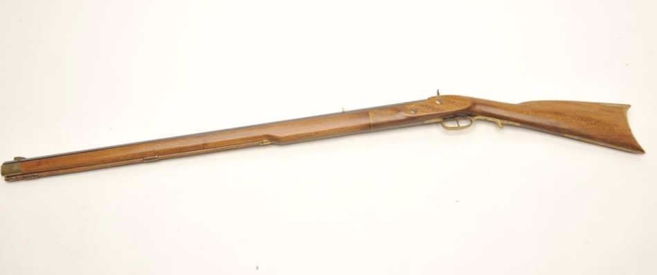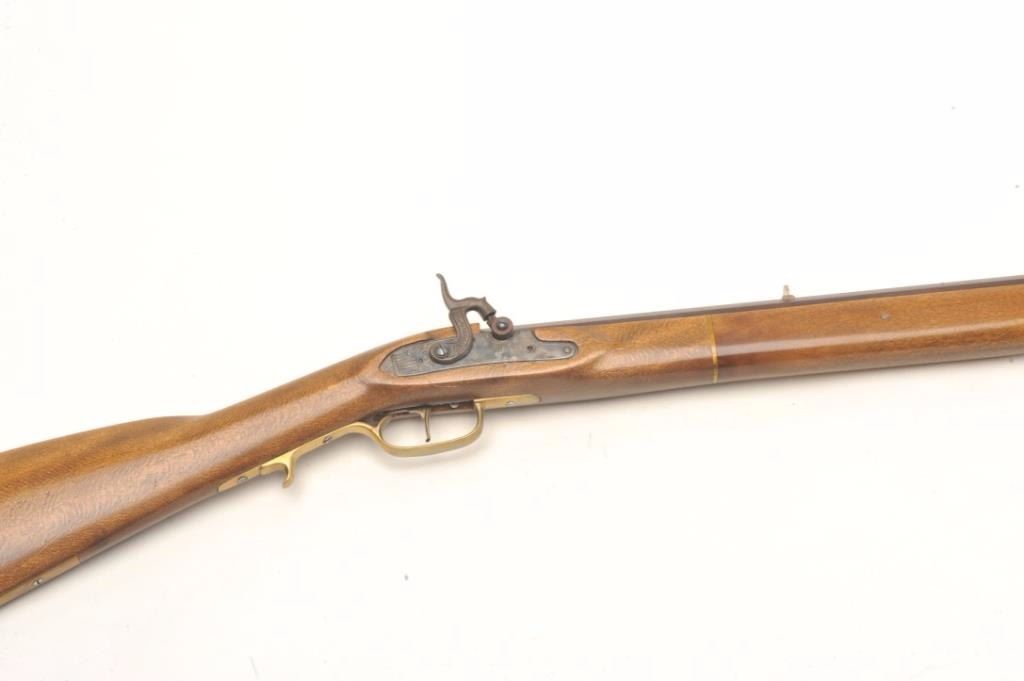 Jukar full-stock black powder percussion rifle, .45 caliber, serial #197369. The rifle is in very good overall condition with a 33 ½” octagon barrel with a brass knife blade front sight. The barrel retains themajority of its browned finish while the side plate shows muted case coloring. The smooth wood full-length stock is in very good condition with only small storage marks noted. The stock features brass hardware and ends with a smooth brass crescent butt plate. A nice reproduction from Spain. Est.: $150-$300.