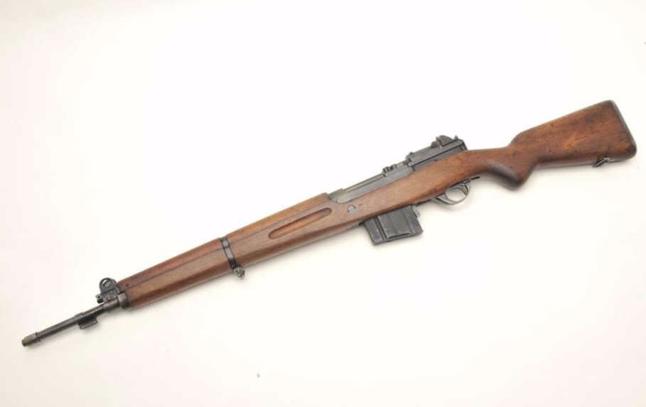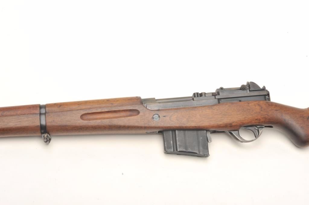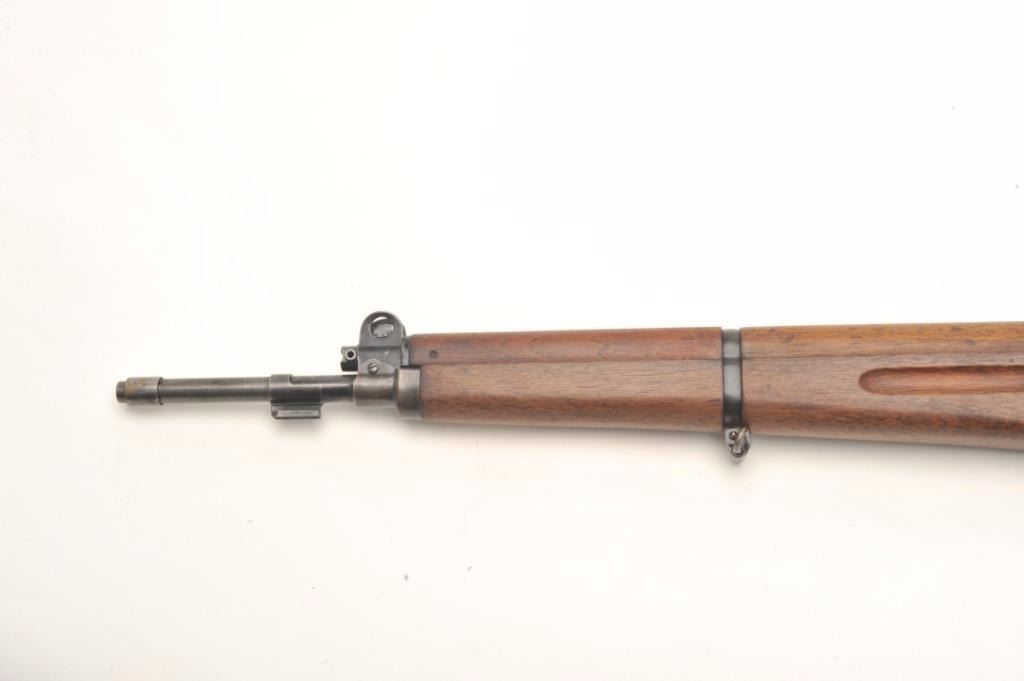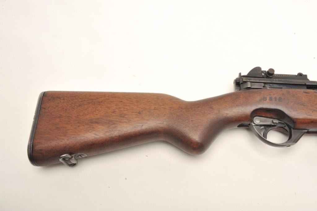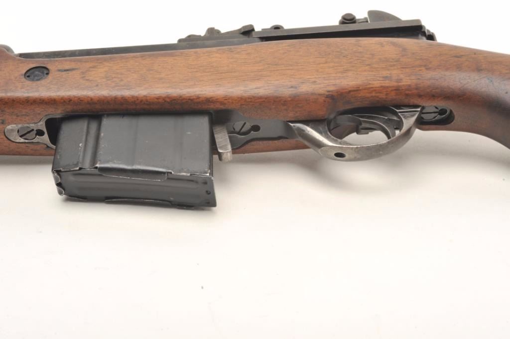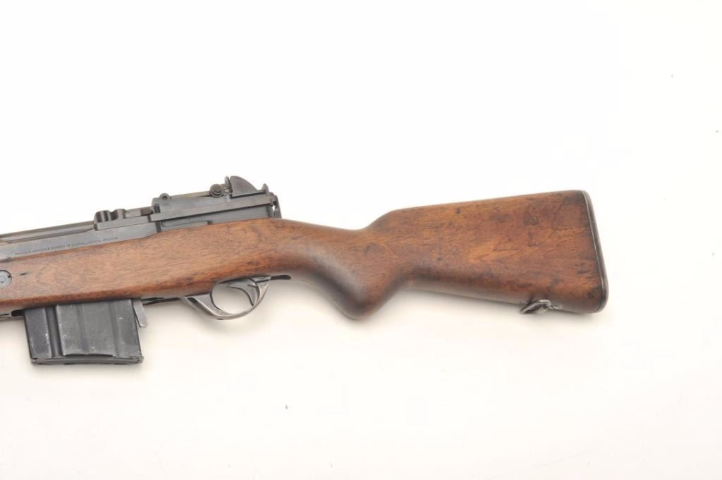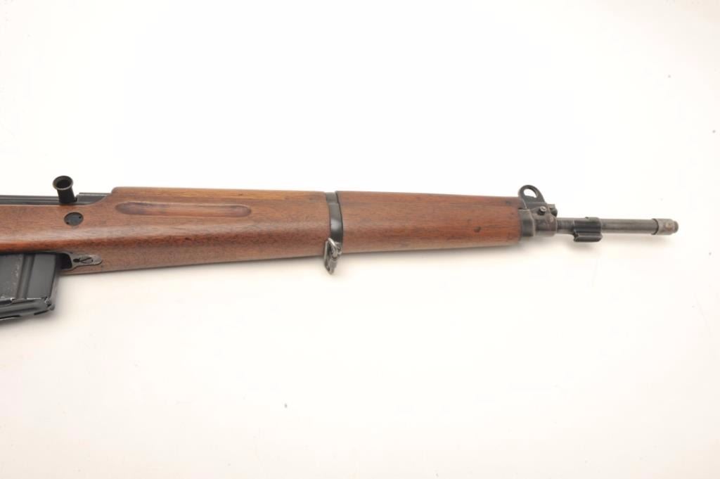 Fabrique Nationale FN 49 semi-auto rifle, .308 caliber, serial #5312. The rifle is in very good condition with a 23” barrel with post front and military tangent style rear sights. The barrel retains a significantamount of its military finish with losses at the muzzle. The receiver shows the majority of its military finish with crisp markings and the Argentine crest on the front receiver ring. The smooth wood stock is in goodcondition, is serialized to the rifle and features an, “ARA” cartouche on the left side of the butt stock. The rifle ends with a checkered steel butt plate with trap. The bore is fair, the action crisp and markingsare sharp. The rifle comes with one correct magazine. Est.: $1,250-$2,000. (Modern).