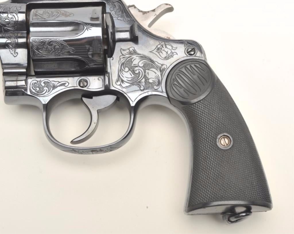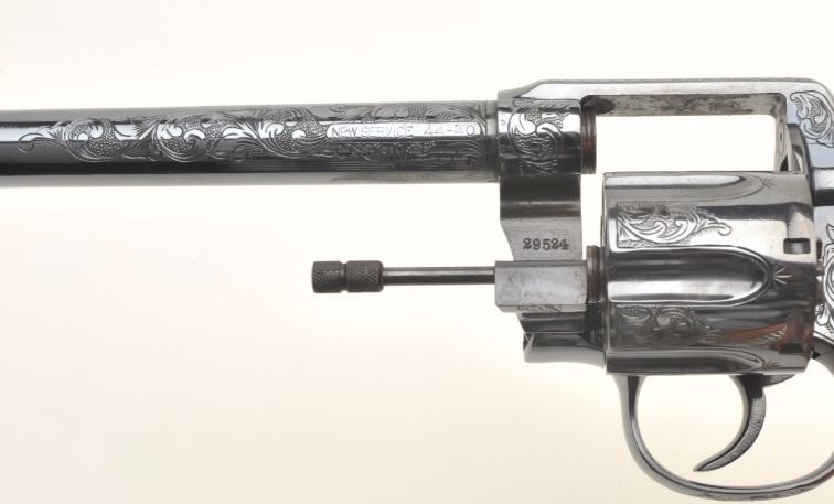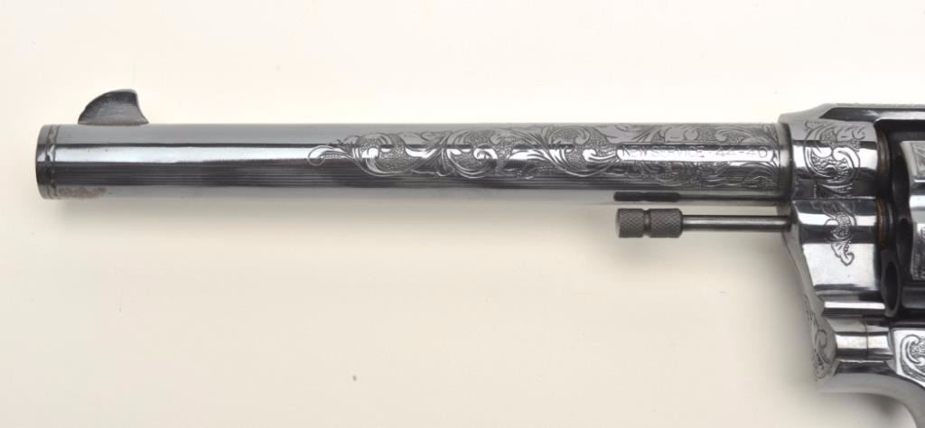 Colt New Service DA revolver, engraved (non-factory), .44-40 caliber, 7.5” barrel, re-blued finish, checkered black hard rubber grips, S/N 29524, in overall very good condition as custom engraved and re-finished; crisp action, sharp markings, very good grips; bore shows some scattered light pitting; nicely executed engraving. (C&R/PPT). Est.: $1,250-$2,500.