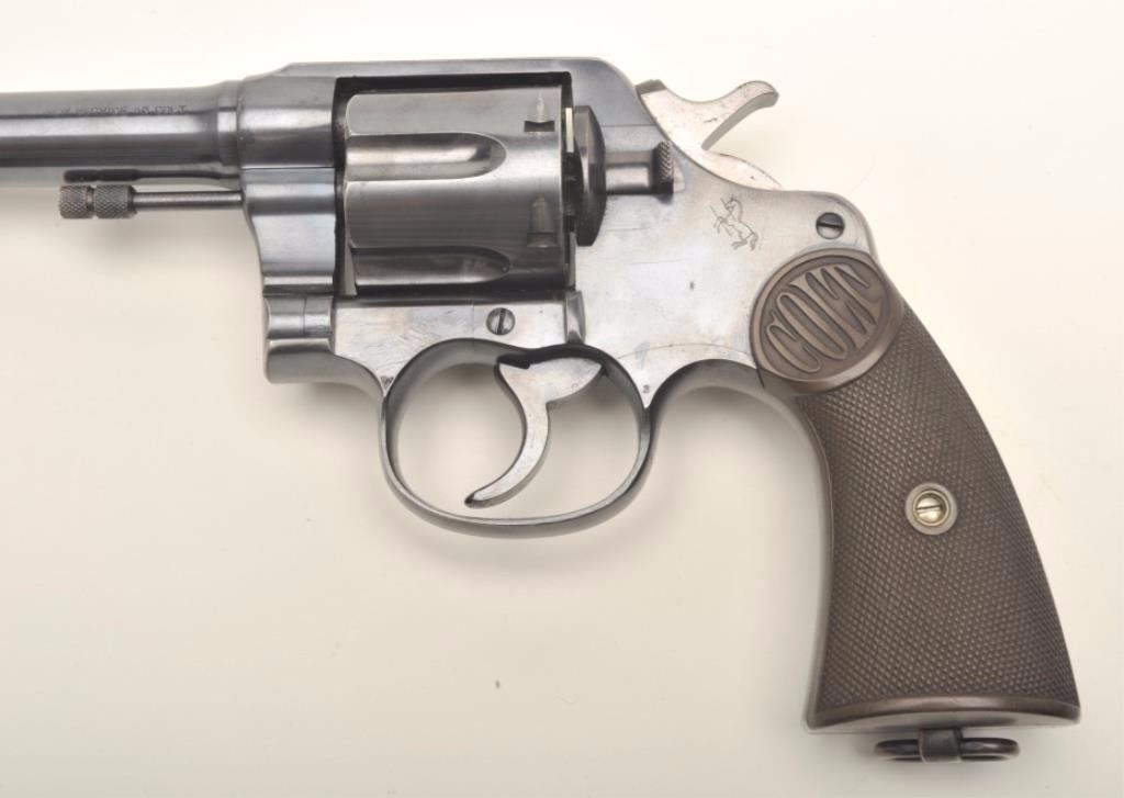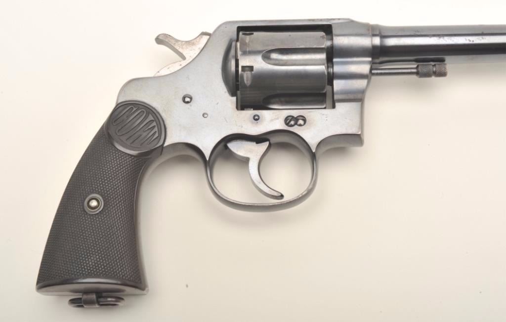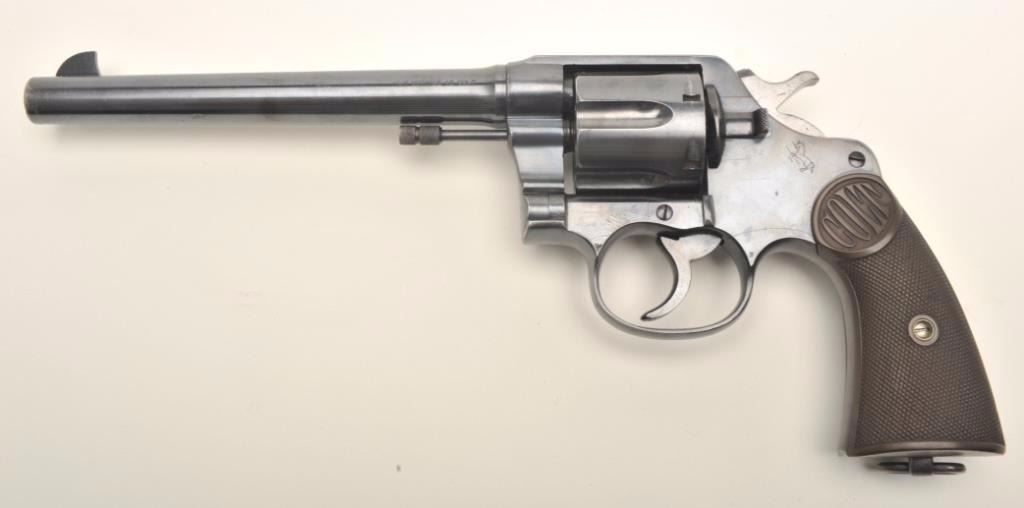 Colt New Service DA revolver, .45 Colt caliber, 7.5” barrel, blued finish, checkered black hard rubber grips, S/N 322098, in overall fine condition showing approximately 96% original blue, fine bore, action,markings and grips. (C&R/PPT). Est.: $1,250-$2,500.