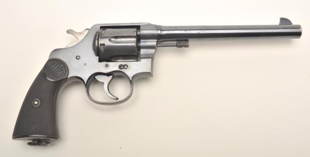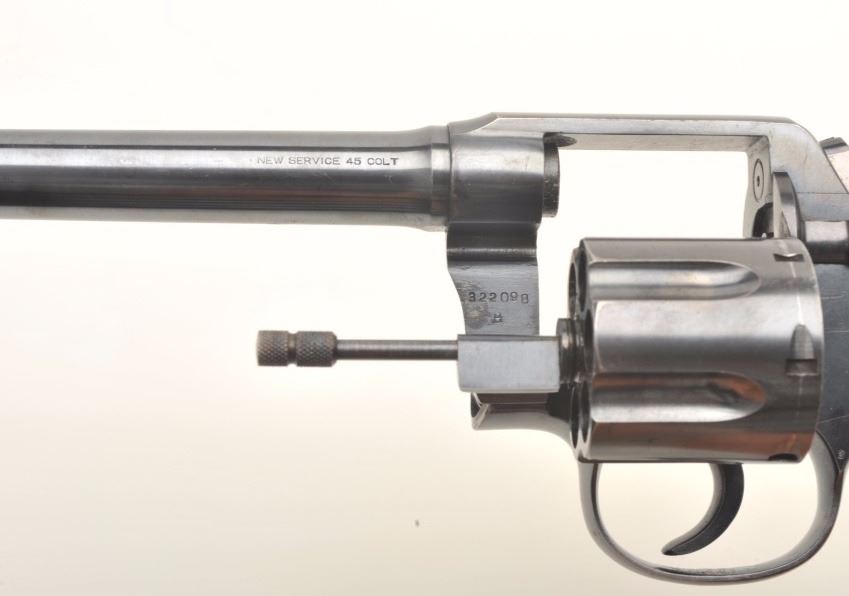 Lot 1531 Colt New Service DA revolver, .45 Colt caliber, 7.5” barrel, blued finish, checkered black hard ru