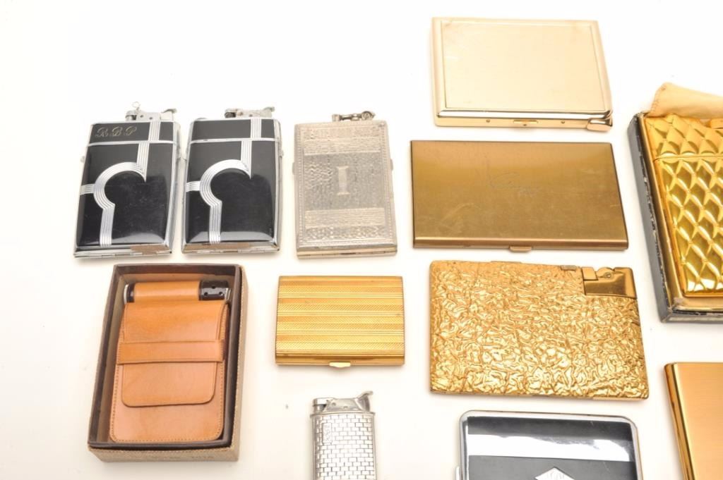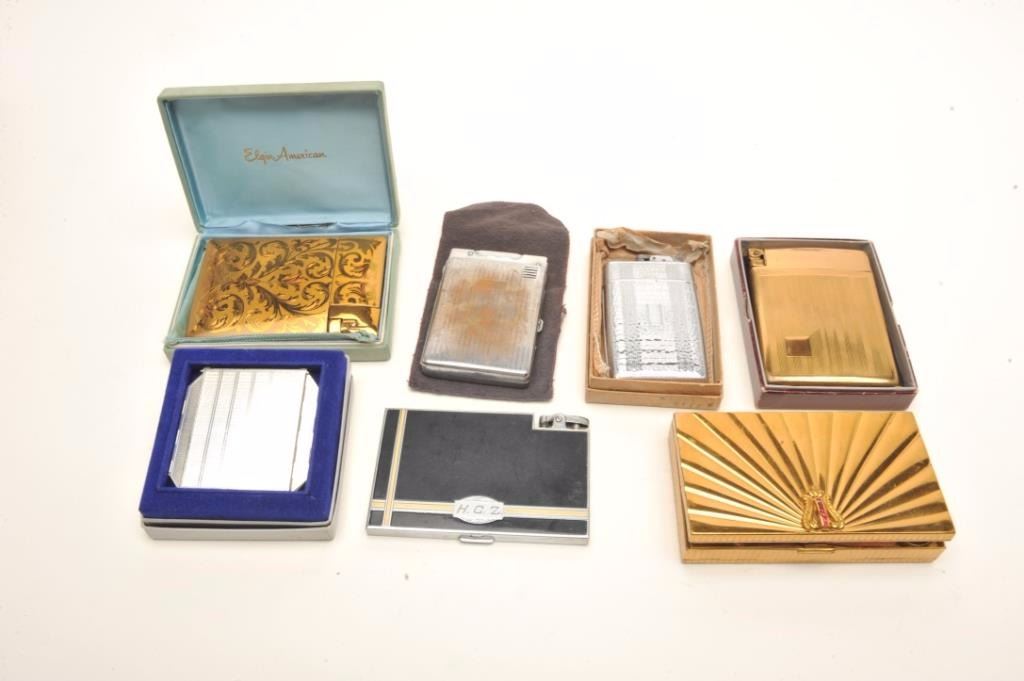 Lot of vintage lighters and cigarette cases including several in their original boxes; makers like Ronson, Elgin American and Evans, different models; several highly decorated and several with initial monograms; onecigarette case advertising Buick Automobiles. (Reference: James Flanagan’s definitive work “The Big Book of Cigarette Lighters”). Est.: $200-$300.
