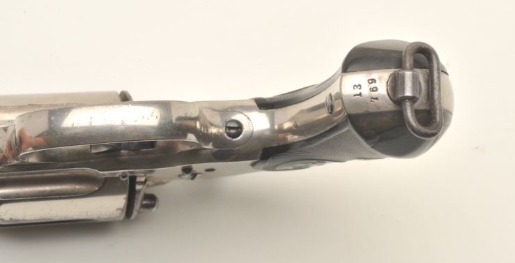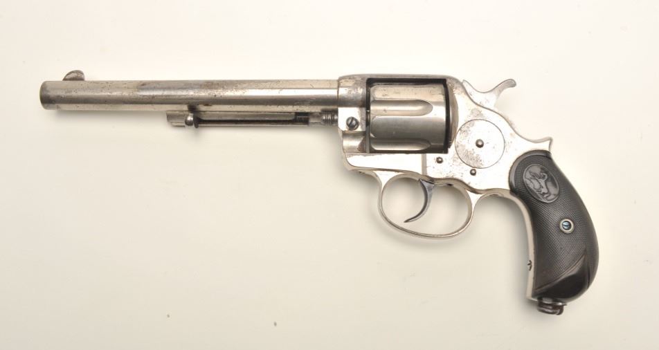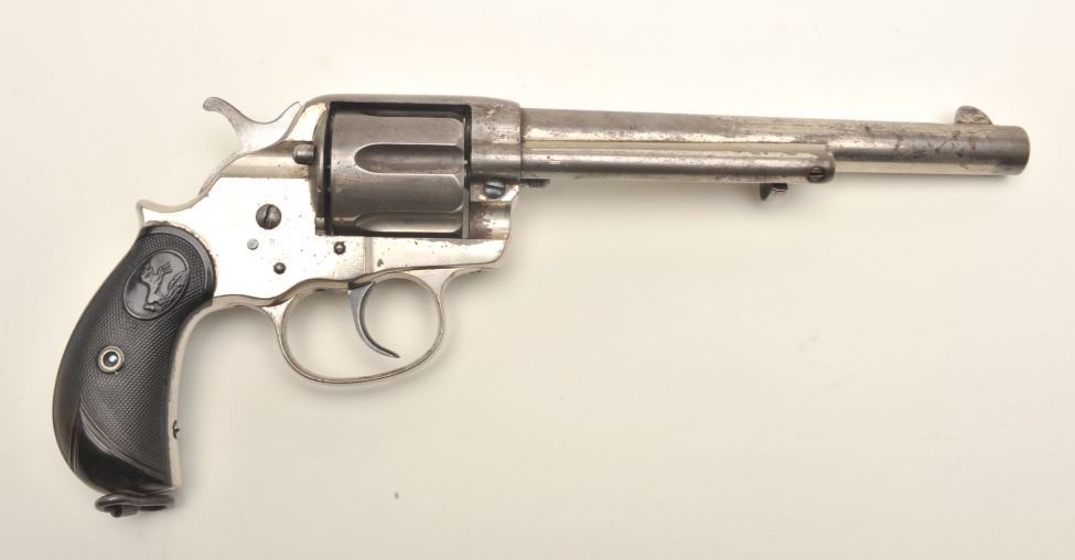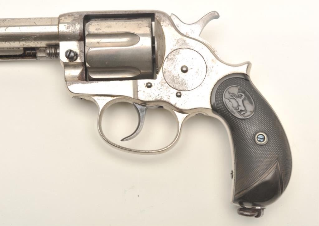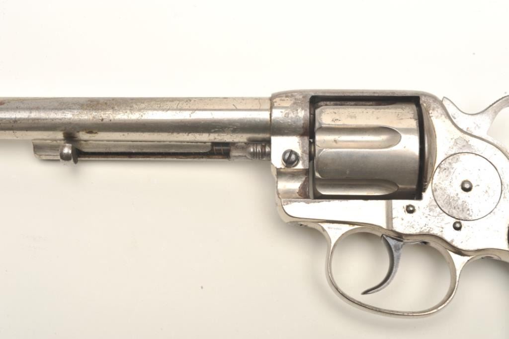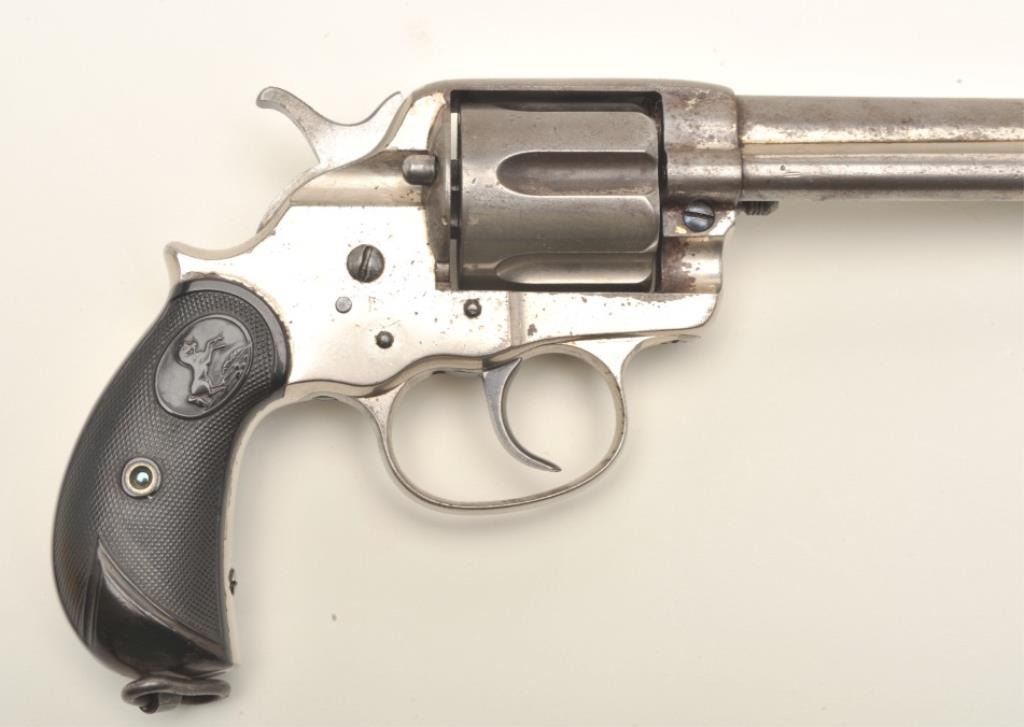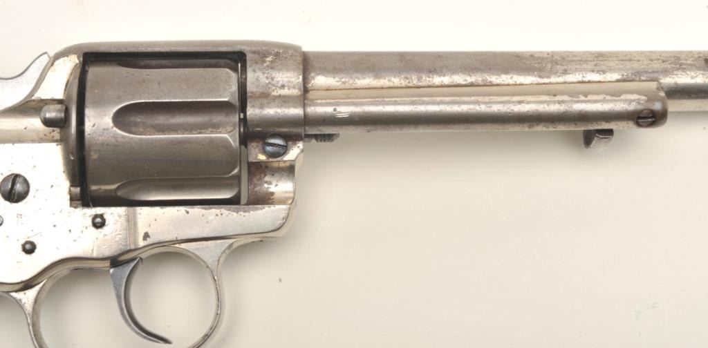 Colt Model 1878 DA revolver with Pall Mall, London barrel address; .45 Colt caliber, 7.5” barrel, nickel finish, checkered black hard rubber grips, S/N 13769, in overall very good condition displaying considerable originalnickel finish, very good bore, crisp action, good markings; grips are good overall with old wear to lower area of both grips. (Antique). Est.: $1,400-$2,800.