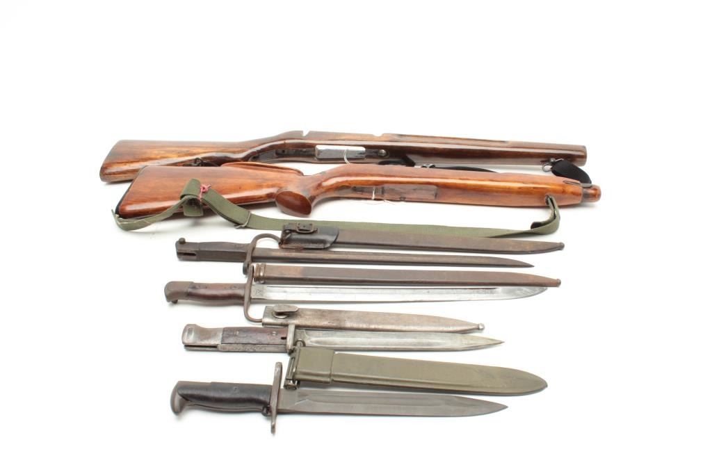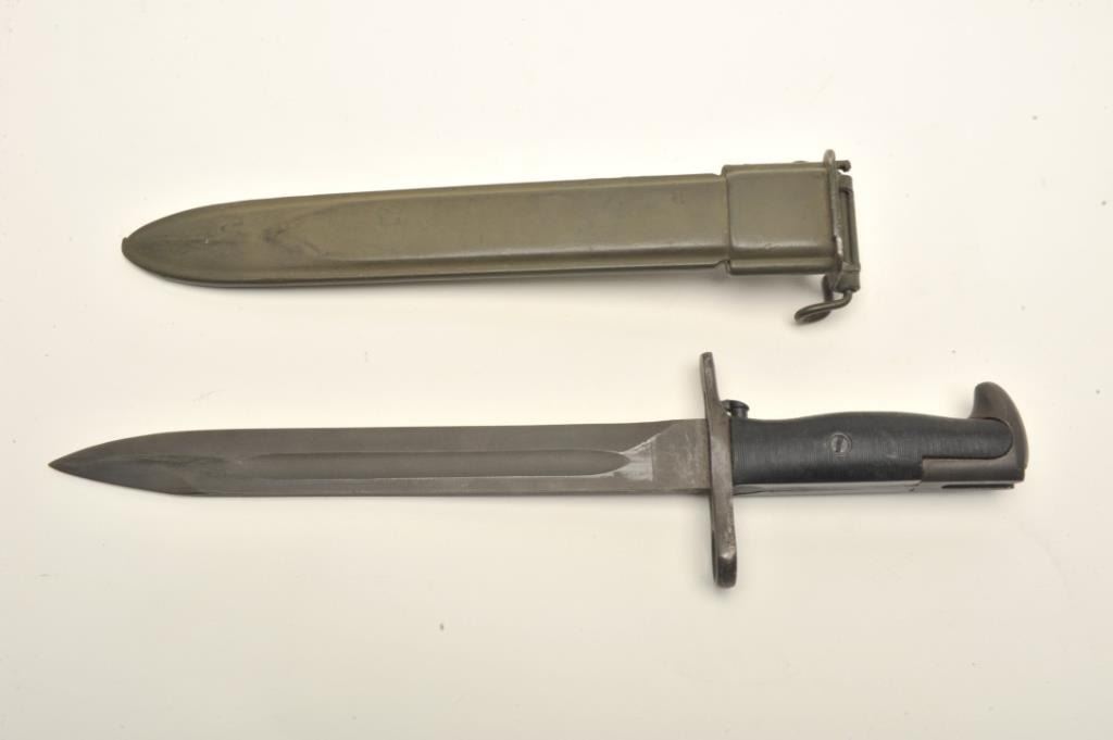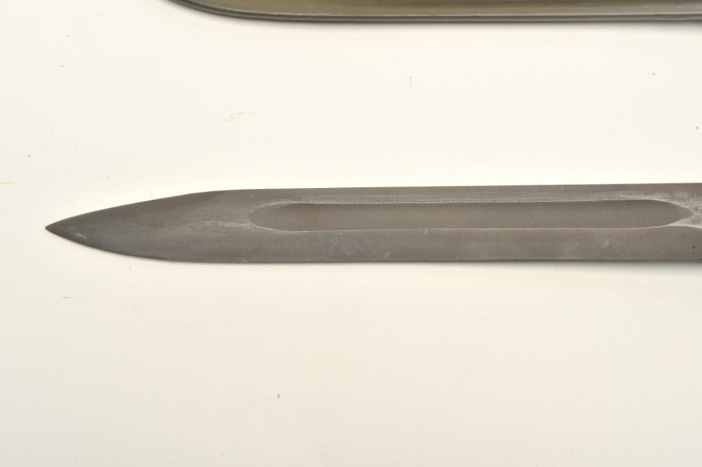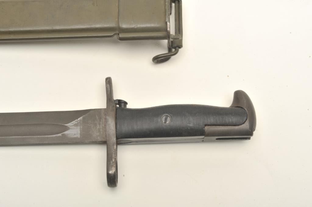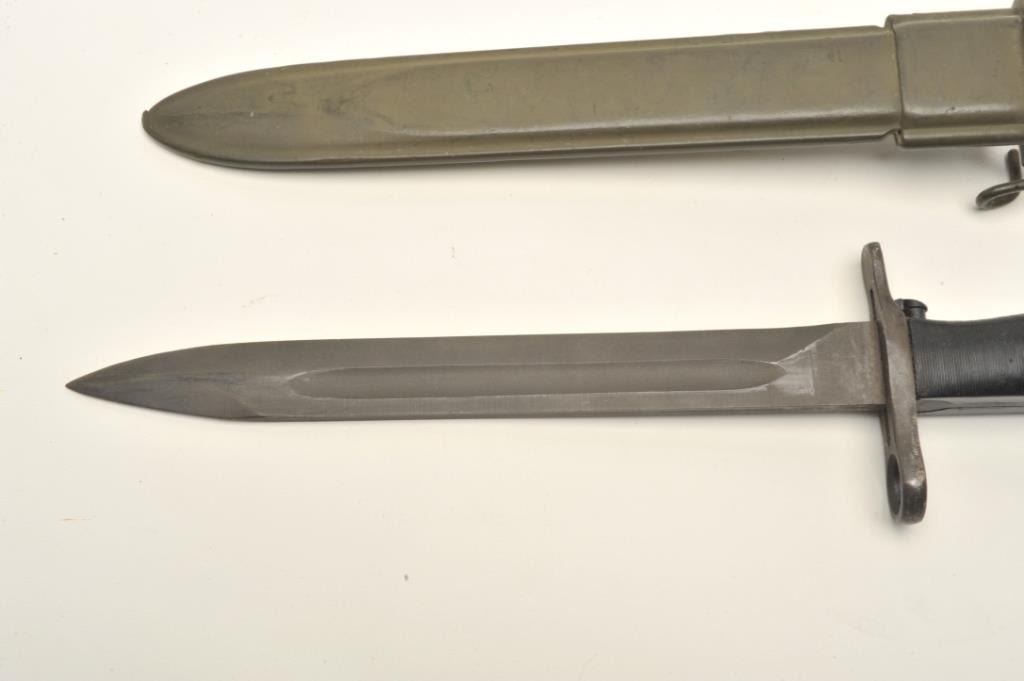 Lot 1558 Lot of two World War II era bayonets. The first is a U.S. M1 Garand bayonet with OD green scabbar