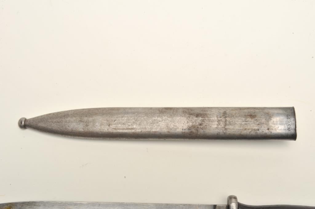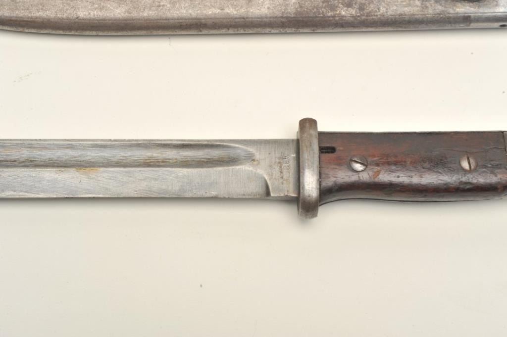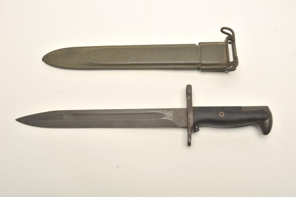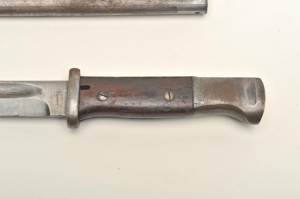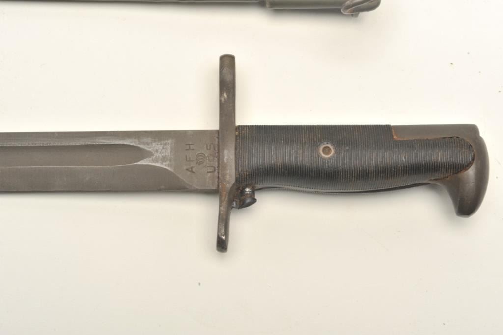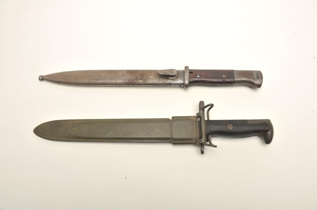 Lot of two World War II era bayonets. The first is a U.S. M1 Garand bayonet with OD green scabbard. The bayonet has an overall length of 14 ½” with a 9 ¾” blade. The bayonet is in good overall condition with the majority of its military finish intact. The is marked, “AFH” with the flaming bomb symbol and “US”. The bayonet features black composite scales. The second bayonet is a Mauser 98 bayonet with metal scabbard. Thebayonet is in good condition with an overall length of 15 1/8” with a 9 7/8” blade. The metal scabbard has gone to a sliver/grey patina and is marked, “44 asw”. The blade is marked, “43 asw” at the handguard. Thebayonet has wood scales which show heavy use. Neither bayonet appears to have been sharpened. Est.: $100-$200.