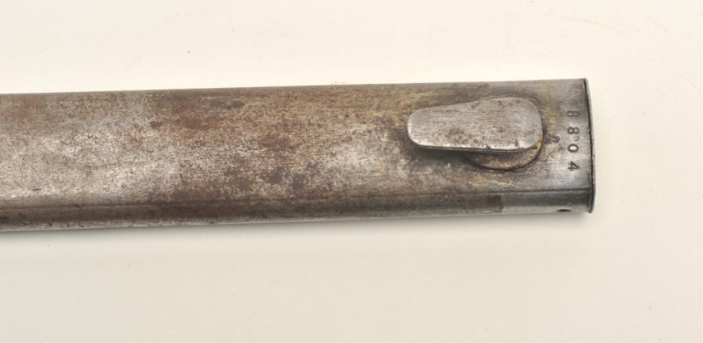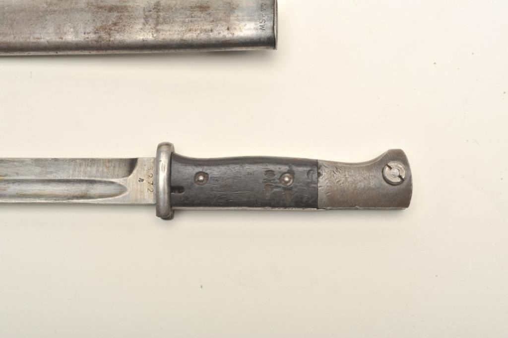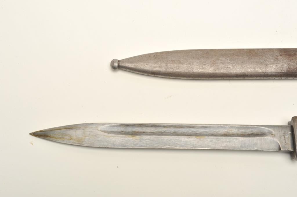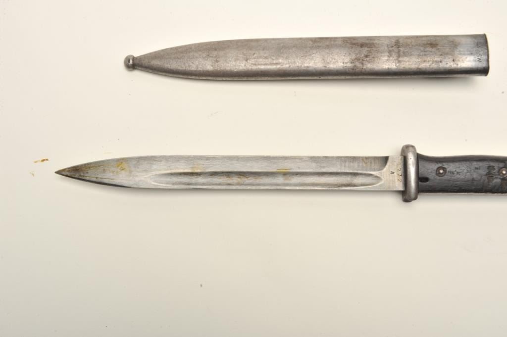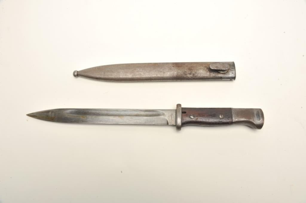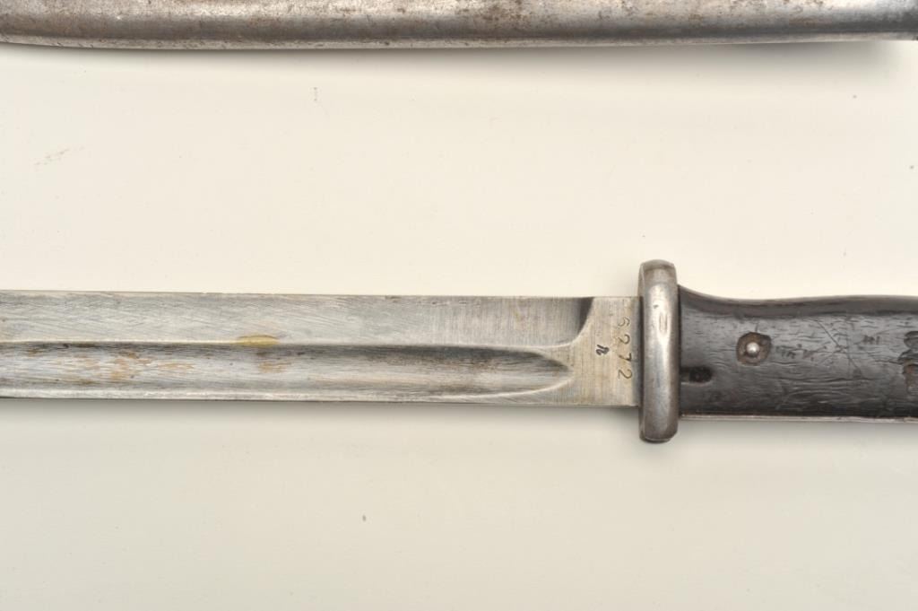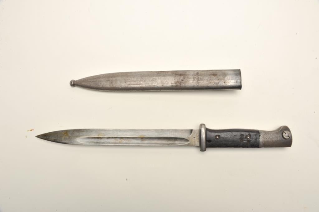 Lot of two World War II era bayonets. The first is a U.S. M1 Garand bayonet with OD green scabbard. The bayonet has an overall length of 14 ½” with a 9 ¾” blade. The bayonet is in good overall condition with the majority of its military finish intact. The is marked, “AFH” with the flaming bomb symbol and “US”. The bayonet features black composite scales. The second bayonet is a Mauser 98 bayonet with metal scabbard. Thebayonet is in good condition with an overall length of 15 1/8” with a 9 7/8” blade. The metal scabbard has gone to a sliver/grey patina and is marked, “44 asw”. The blade is marked, “43 asw” at the handguard. Thebayonet has wood scales which show heavy use. Neither bayonet appears to have been sharpened. Est.: $100-$200.