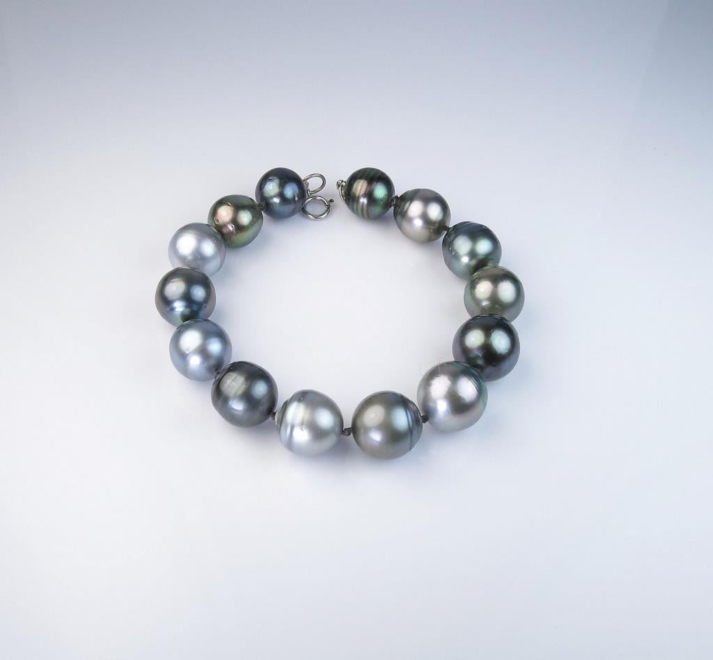 Tahitian Black Pearl Bracelet averaging between 11.00 - 13.00 mm in diameter with silver to gray overtones. Estimates $800-$1,200