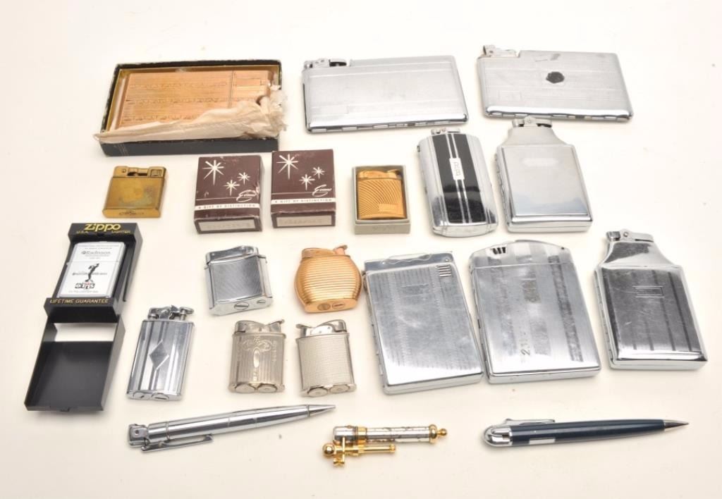 Lot of vintage lighters including those by makers Evans, Ronson and Zippo; various sizes and a number with their original cardboard boxes. (Reference: James Flanagan’s definitive work “The Big Book of CigaretteLighters”). Est.: $150-$300.