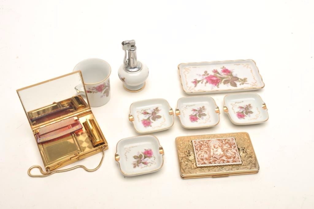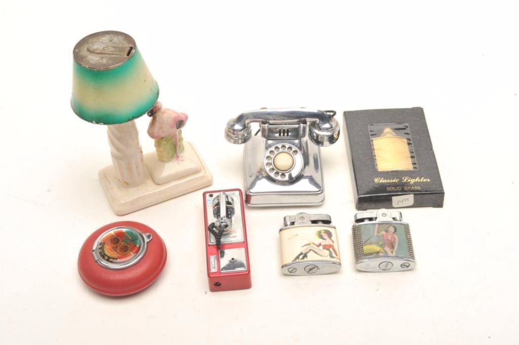 Small lot of tobacco-related vintage collectibles including a porcelain set with tray, ashtrays, lighter and cigarette cup; a novelty telephone lighter; metal iron wall hanger for wood matches; 2 “cheesecake” older lighters; a brass and pink enamel two-piece cigarette tabletop case in the form of a push cart and more. (Reference: James Flanagan’s definitive work “The Big Book of Cigarette Lighters”). Est.: $50-$100.