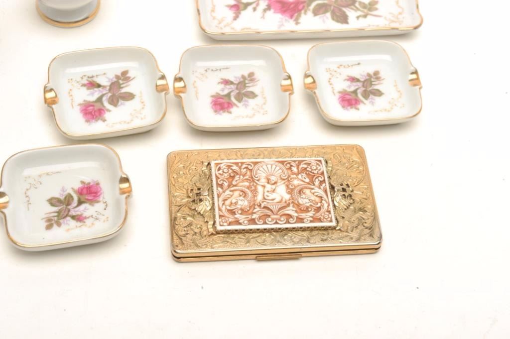 Lot 1572 Small lot of tobacco-related vintage collectibles including a porcelain set with tray, ashtrays, l