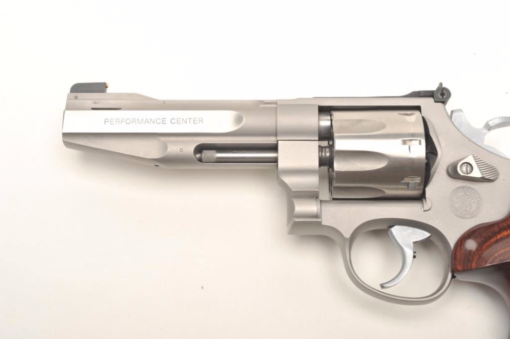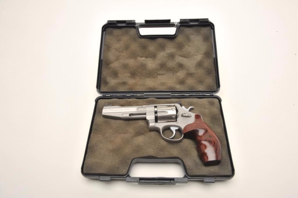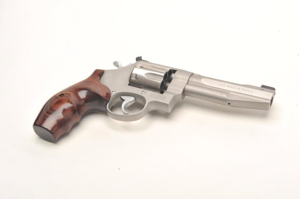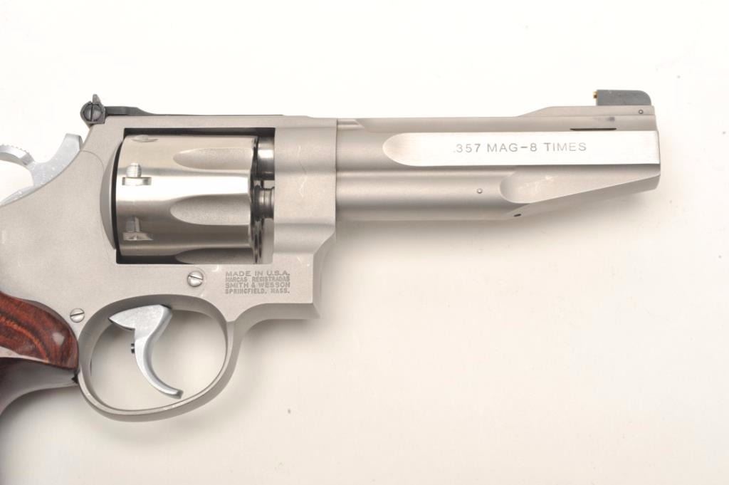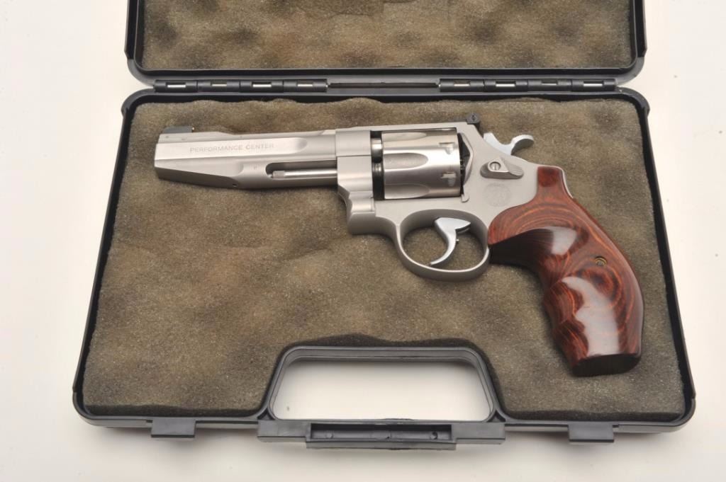 Smith & Wesson Mod 627-PC Performance Center .357 Magnum, 8-shot cylinder. # HCP0009. One of 95 made by the custom shop for Lew Horton, this is #9. 5-inch Magna- ported barrel, adjustable sights, smooth roundbutt rosewoodgrips, stainless finish. Gun is in fine condition overall, with slight dragline on cylinder. Bore is very good, with original case. Online sales of this model are approximately $4000. Est. $2000-4000. (Modern PPT)