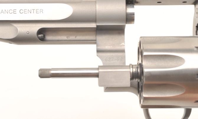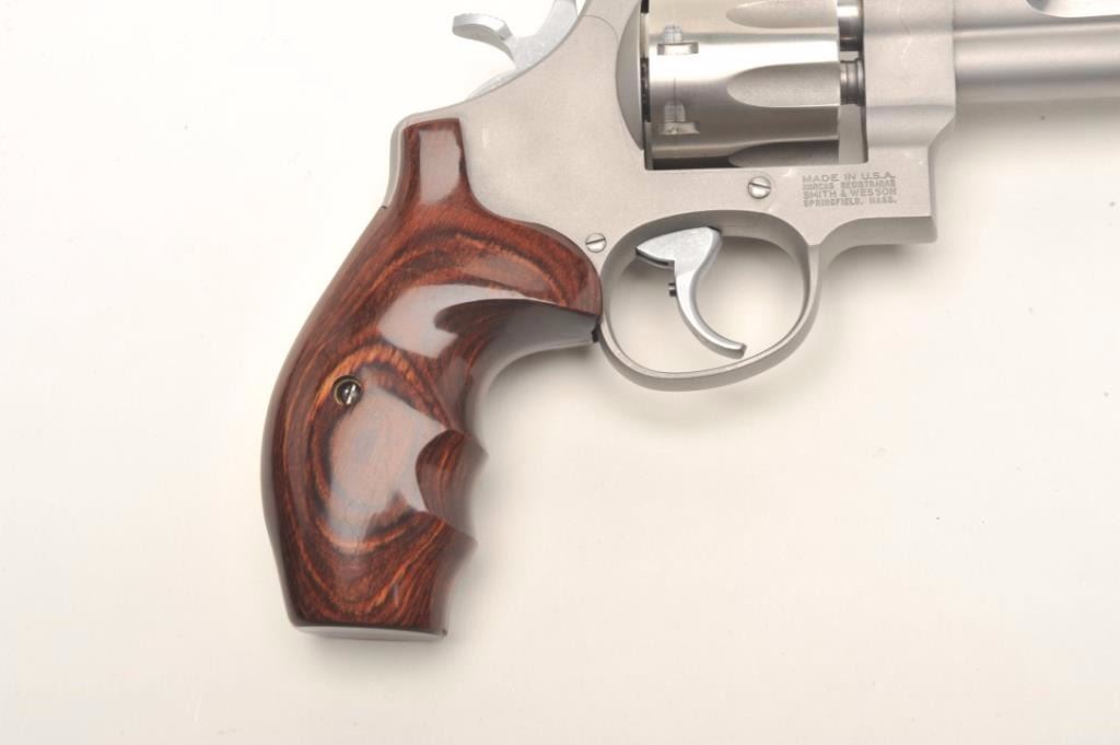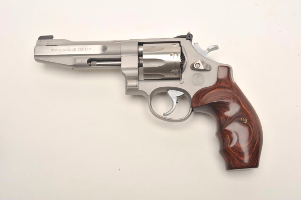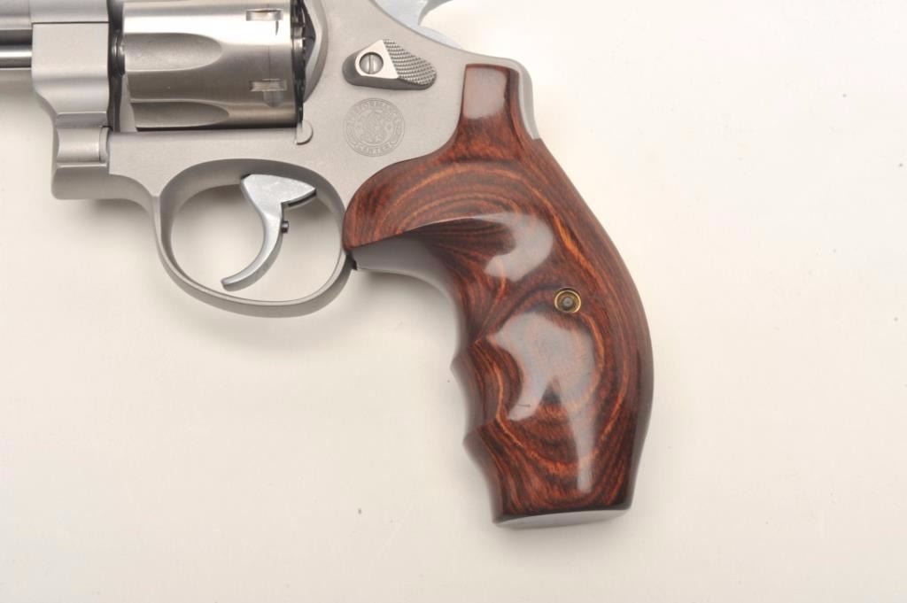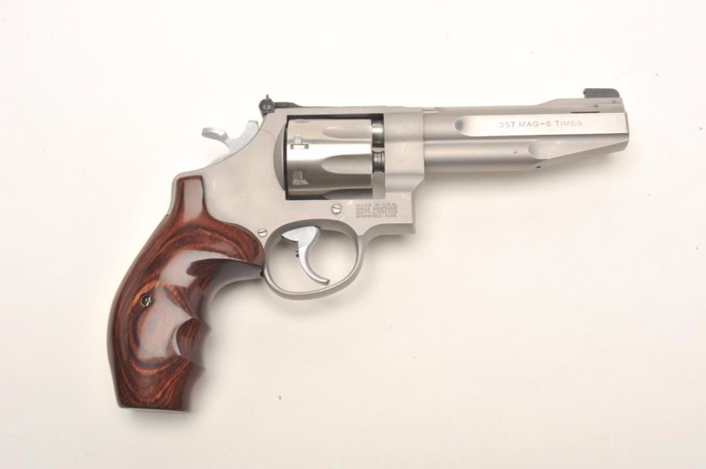 Smith & Wesson Mod 627-PC Performance Center .357 Magnum, 8-shot cylinder. # HCP0009. One of 95 made by the custom shop for Lew Horton, this is #9. 5-inch Magna- ported barrel, adjustable sights, smooth roundbutt rosewoodgrips, stainless finish. Gun is in fine condition overall, with slight dragline on cylinder. Bore is very good, with original case. Online sales of this model are approximately $4000. Est. $2000-4000. (Modern PPT)