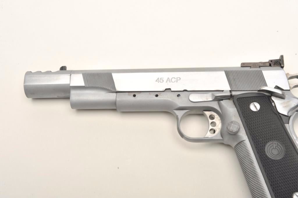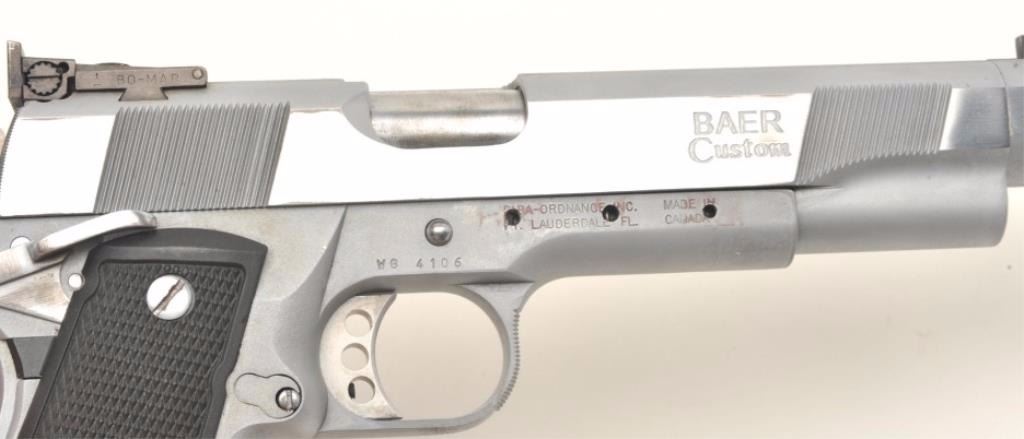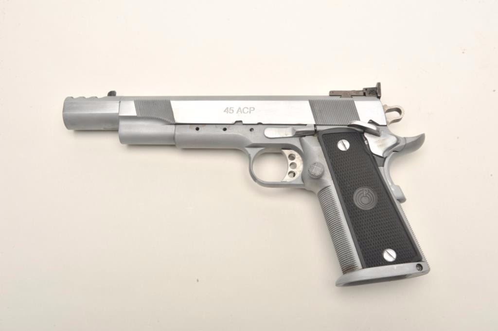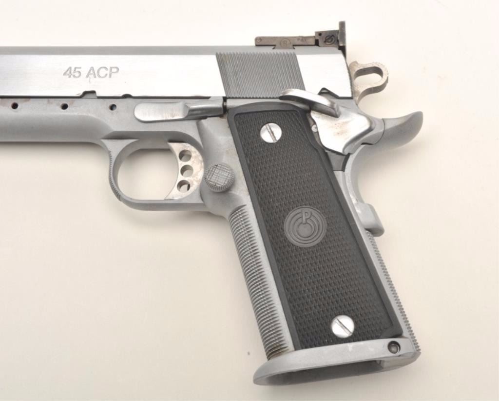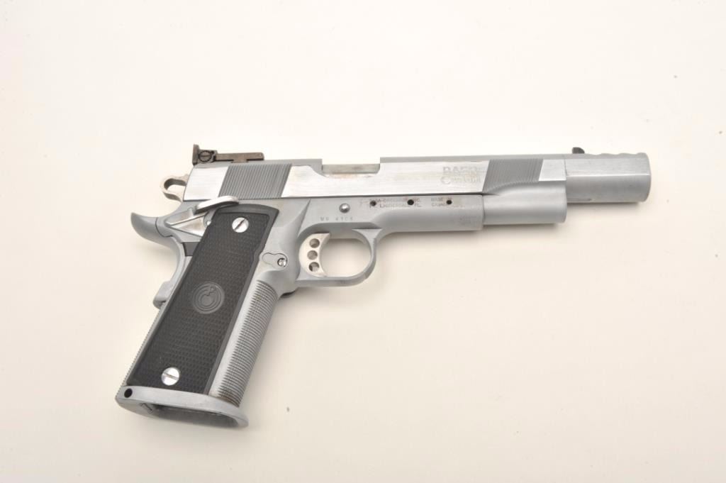 Early stainless Les Baer Custom Master Combat on Para Ordnance P-13 frame, #WG4106. 5" stainless match barrel with compensated bushing, adjustable trigger, extended ambidextrous safety, extended mag release,adjustable sights, plastic checkered grips, mag funnel, and extended beavertail. The frame has 3 holes drilled on each side for the attachment of a scope mount, which is not present. Overall condition is good to verygood, showing use. No magazine. Est. $1250-2500. (Modern, PPT)
