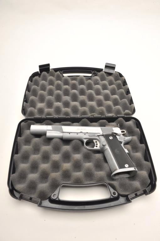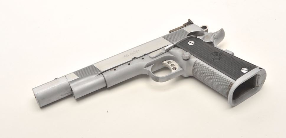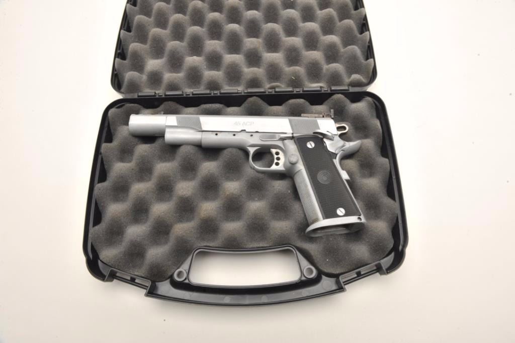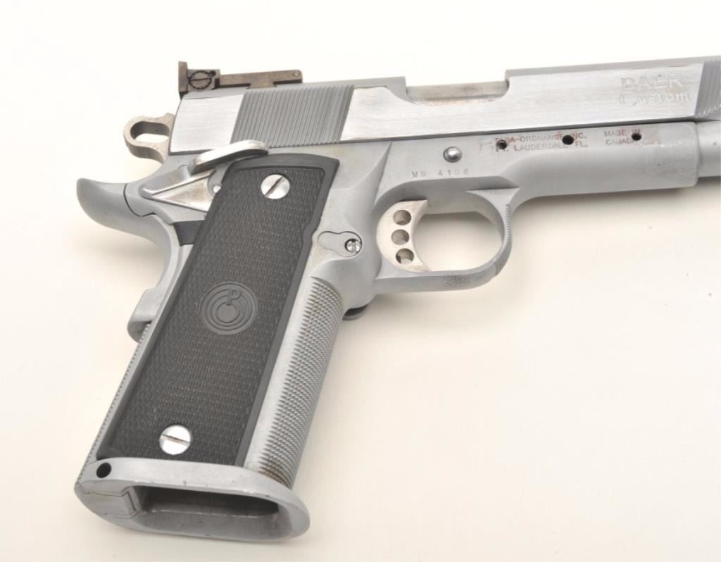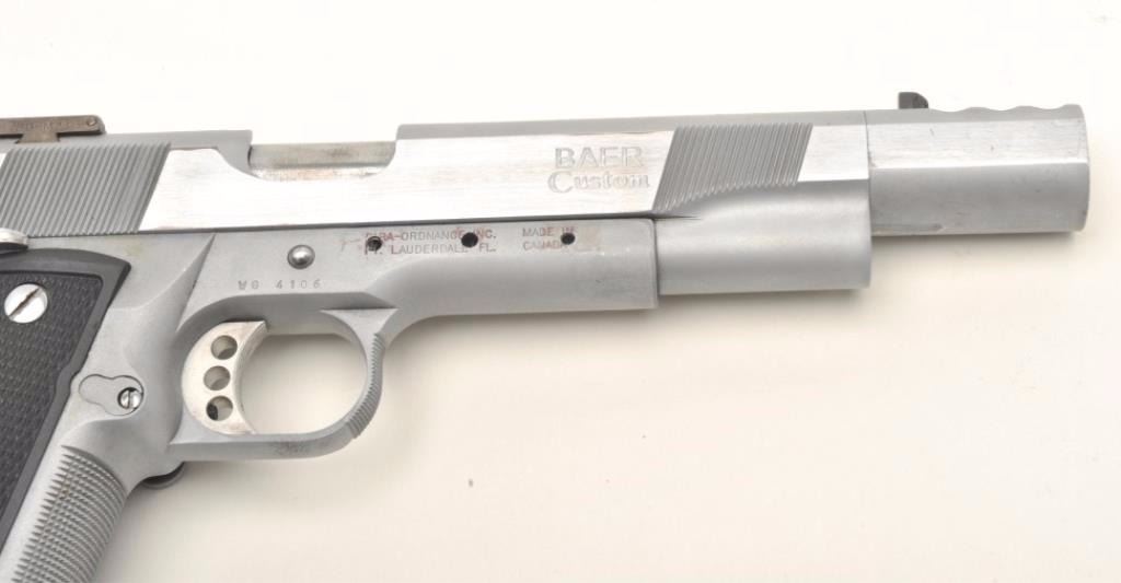 Early stainless Les Baer Custom Master Combat on Para Ordnance P-13 frame, #WG4106. 5" stainless match barrel with compensated bushing, adjustable trigger, extended ambidextrous safety, extended mag release,adjustable sights, plastic checkered grips, mag funnel, and extended beavertail. The frame has 3 holes drilled on each side for the attachment of a scope mount, which is not present. Overall condition is good to verygood, showing use. No magazine. Est. $1250-2500. (Modern, PPT)