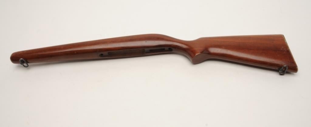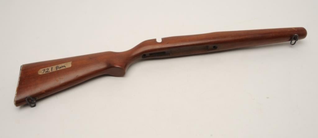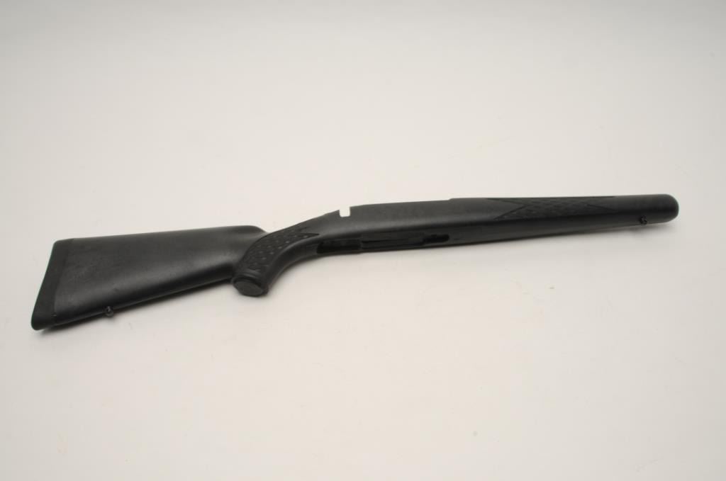 Lot of two Remington stocks. The first is marked for a Remington 712, with smooth wood finish in good overall condition with slings swivels and a metal butt plate. The second is a black, synthetic Ram-Line marked for aRemington 600 in good overall condition. One money buys them both. Est.: $50-$100.
