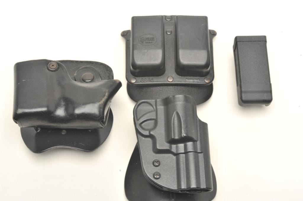 Lot of magazine holders, hand cuff case and holster. A nylon Fobus double magazine holder, nylon single holder, leather magazine and hand cuffs paddle style and an Uncle Mike’s hard plastic paddle holster. Est.:$25-$75.